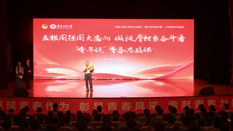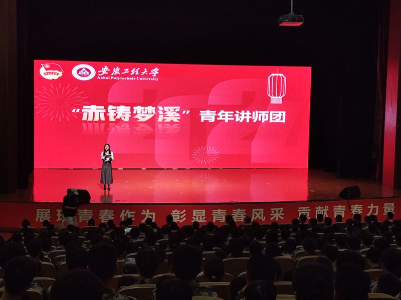 5位讲师团成员带来的“青年说”宣讲,以“小切口”讲“大道理”,通过一个个生动的故事,充满激情与感染的讲述,带领全场师生沉浸式感受信仰与榜样带给我们的启发与力量,着力用青言青语推动党的创新理论“声入人心”。经济与管理学院物流221班程畅、马克思主义学院马理论22级研究生卜邹连讲述“青年说信仰”,通过讲述抗美援朝烈士李家发、抗日英烈杨靖宇、“杂交水稻之父”袁隆平和抗洪救灾的广大官兵群众为党、为国家、为人民无私奉献的光辉事迹,带领大家领略了共产党员那份坚守与信仰的力量;数理与金融学院金融211阮友慧讲述“青年说校史”,向新生们介绍了安徽工程大学的办学历史,激励新生们学校史、知校情、感校恩,传承安工程“集中力量办大事”的精神,传承红色基因,争做时代新人;化学与环境工程学院应拔211班凌远志的“青年说创新”从青年人视角出发带领大家了解新质生产力,鼓励青年学子勇于探索、敢于创新,让青春在创新创造中闪光;人文学院电商法231班张振的“青年说榜样”,通过讲述学校荚新民老师不求回报,自愿交纳50万元党费的壮举,鼓励团员青年要树立正确的家庭观念、培养家国情怀,坚定对党的信仰和忠诚,将个人的梦想与国家的发展紧密相连。