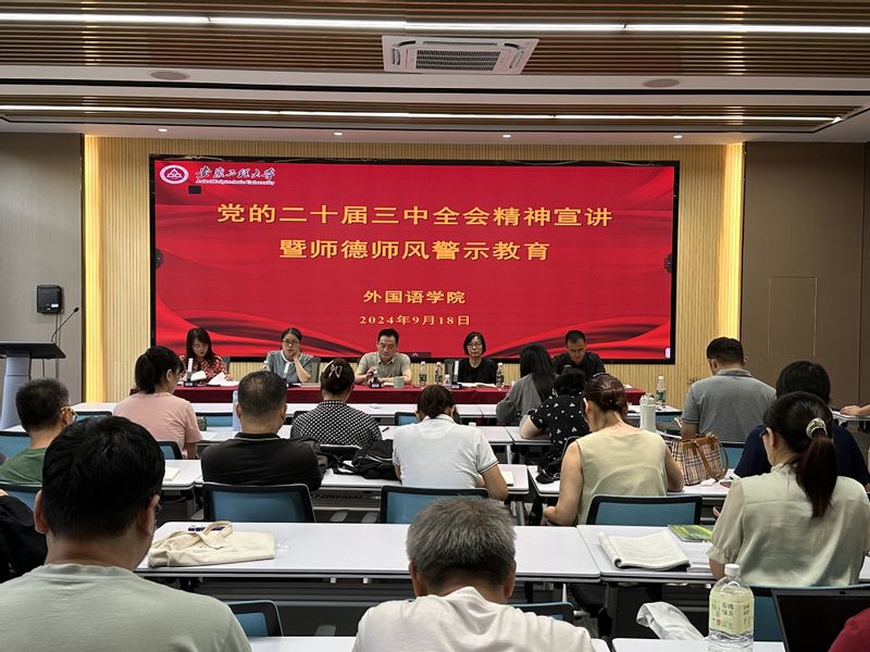 本网讯 9月18日,外国语学院在9J209会议室召开学院党委理论学习中心组(扩大)会议,集中学习党的二十届三中全会精神,开展师德师风专题教育。学院党政领导、党委理论学习中心组成员、各党支部书记、教职员工参会。会议由学院党委书记董金权主持。
