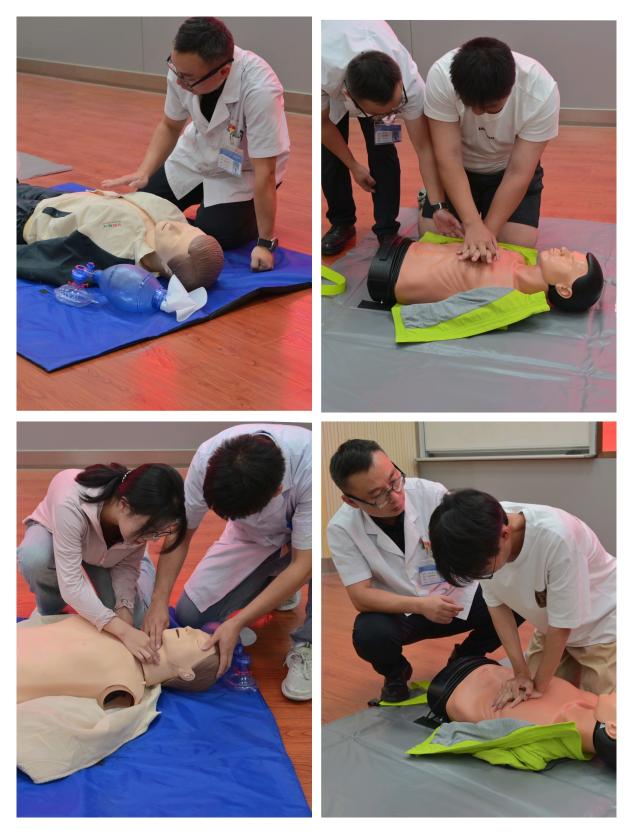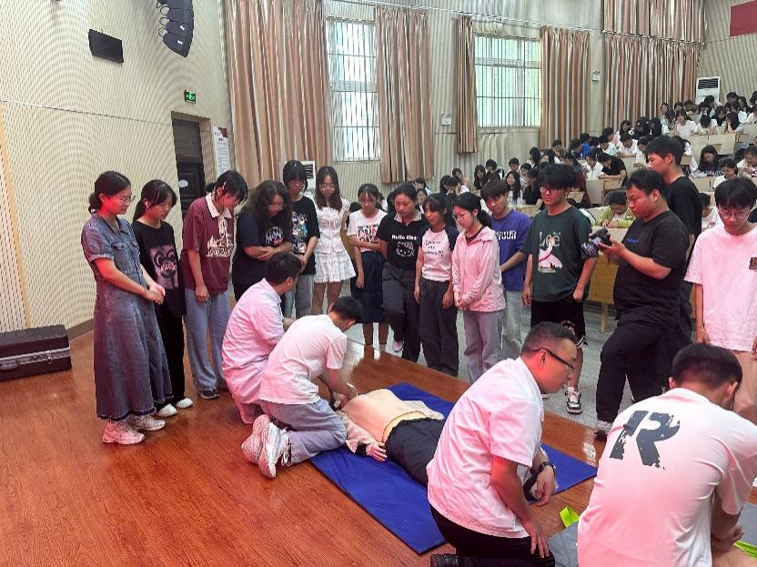 在实践操作环节,侯捷使用心肺复苏模拟人进行实际操作演示。同学们在现场医师的指导下使用心肺复苏模拟人进行练习,在轻松愉悦的氛围中不仅学习了急救技能,而且提高了安全意识和自救互救能力。