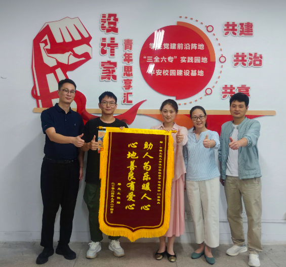 本网讯 9月24日,滕敏女士来到设计学院“一站式”学生社区,给环境设计223班孙振冉同学送上锦旗,感谢他扶助自己的父亲。