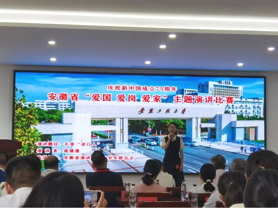 晁倩倩同学经安徽省演讲学会大学生联合会推荐、选拔,最终成功入围决赛。决赛中,作为全场年龄最小的选手,晁倩倩同学沉着冷静,用真挚的情感、细腻的语言,以《不美“逆行人”》为题讲述发生在身边的真实故事,阐述了青年人的责任和担当,在众多选手中脱颖而出,展现出了大学生群体积极向上的精神面貌,为学校争得了荣誉。