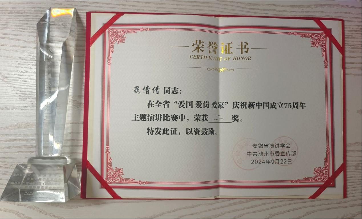 本网讯 近日,由安徽省演讲学会和中共池州市委宣传部联合主办的全省“爱国 爱岗 爱家”主题演讲大赛在池州成功举办。电气工程学院(集成电路学院)电子233晁倩倩同学荣获省二等奖。