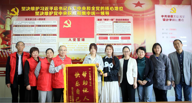 本网讯 10月9日,“芜湖好人”兰平先生与芜湖市弋江区爱心公益志愿者协会赴校设计学院,给视觉传达设计系教师党支部和大学生志愿者们送上锦旗,感谢支部老师们指导大学生开展军训服捐赠的实践活动,为社区送去温暖。