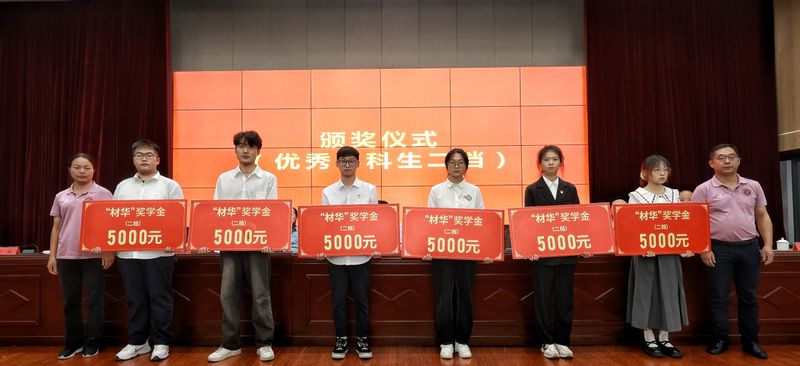 郑健、李源林共同为获得“材华”奖教金的老师颁奖。陶玉贵、杜松涛、方玖胜、刘琪、陶锋分别为获得“材华”奖学金的学生颁奖。
