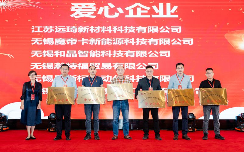 大会为无锡优秀校友工作者颁发荣誉证书,为无锡贝斯柯自动化科技有限公司、无锡乐力彩纺织化工材料有限公司、无锡魔帝卡新能源科技有限公司等6家校友企业颁发爱心企业奖牌。