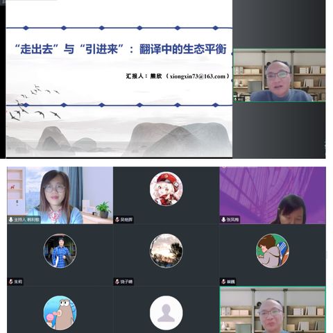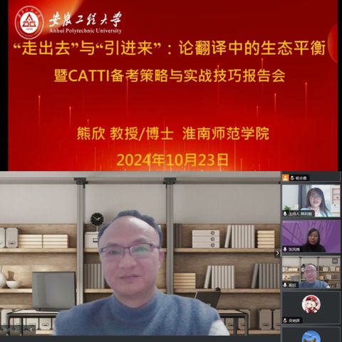 本网讯 10月23日,外国语学院通过腾讯会议开展了全国翻译专业资格(水平)考试(China Accreditation Test for Translators and Interpreters,简称CATTI)备考策略与实战技巧报告会,活动邀请淮南师范学院教授熊欣博士,做了题为《“走出去”与“引进来”:论翻译中的生态平衡》的学术报告,针对CATTI二级笔译考试对研究生进行了考前指导。副院长韩利敏教授、张凤梅教授、学院硕士生导师以及全体研究生参加了此次线上学术交流活动,活动由副院长韩利敏在线主持。