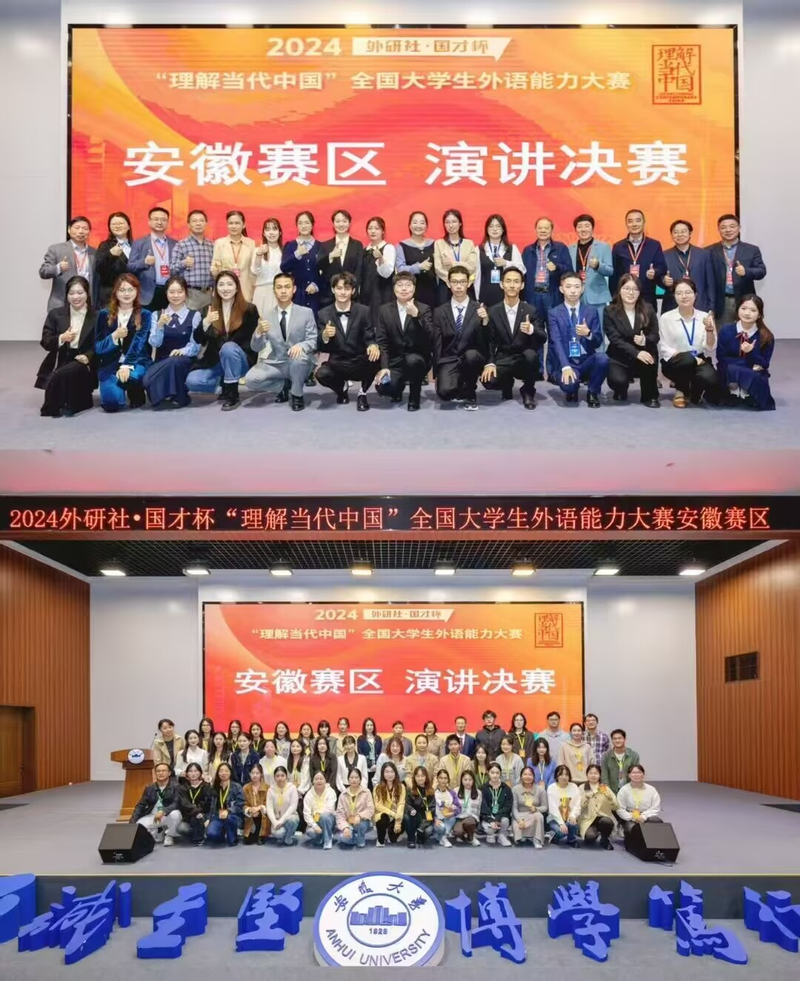 “外研社·国才杯”“理解当代中国”全国大学生外语能力大赛由外语教学与研究出版社、教育部高等学校大学外语教学指导委员会、教育部高等学校英语专业教学指导委员会和中国外语与教育研究中心共同举办,安徽赛区决赛由安徽省教育厅主办,安徽大学承办,该赛事设置综合能力、演讲、笔译、口译和短视频等多个赛项,全面考察选手的外语能力和综合素质,是检验高校外语教学成果、培养高素质外语人才重要平台,也是提升大学生外语应用能力和国际传播能力的有效途径。同学们在比赛中充分诠释了自己对中国之路、中国之治、中国之理的理解,展现了自己的外语能力、跨文化能力、思辨能力、创新能力等综合素养。