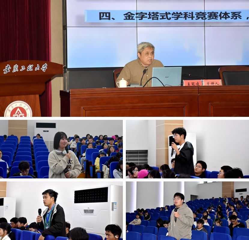 王冠凌教授围绕聚力立德树人、践行社会责任,夯实学生社团、构建自主研学体系,以学生为中心、搭建创新创业实验室,金字塔式学科竞赛体系、提高学生创新创业能力四个方面作了生动的报告。他以丰富的指导学生参赛的经验鼓励学生从小事做起、从参加志愿服务做起、从参加社团做起、从参加校赛做起,提高自身创新创业能力。在互动交流环节,同学们积极提问,王冠凌耐心进行解答并给出建议。