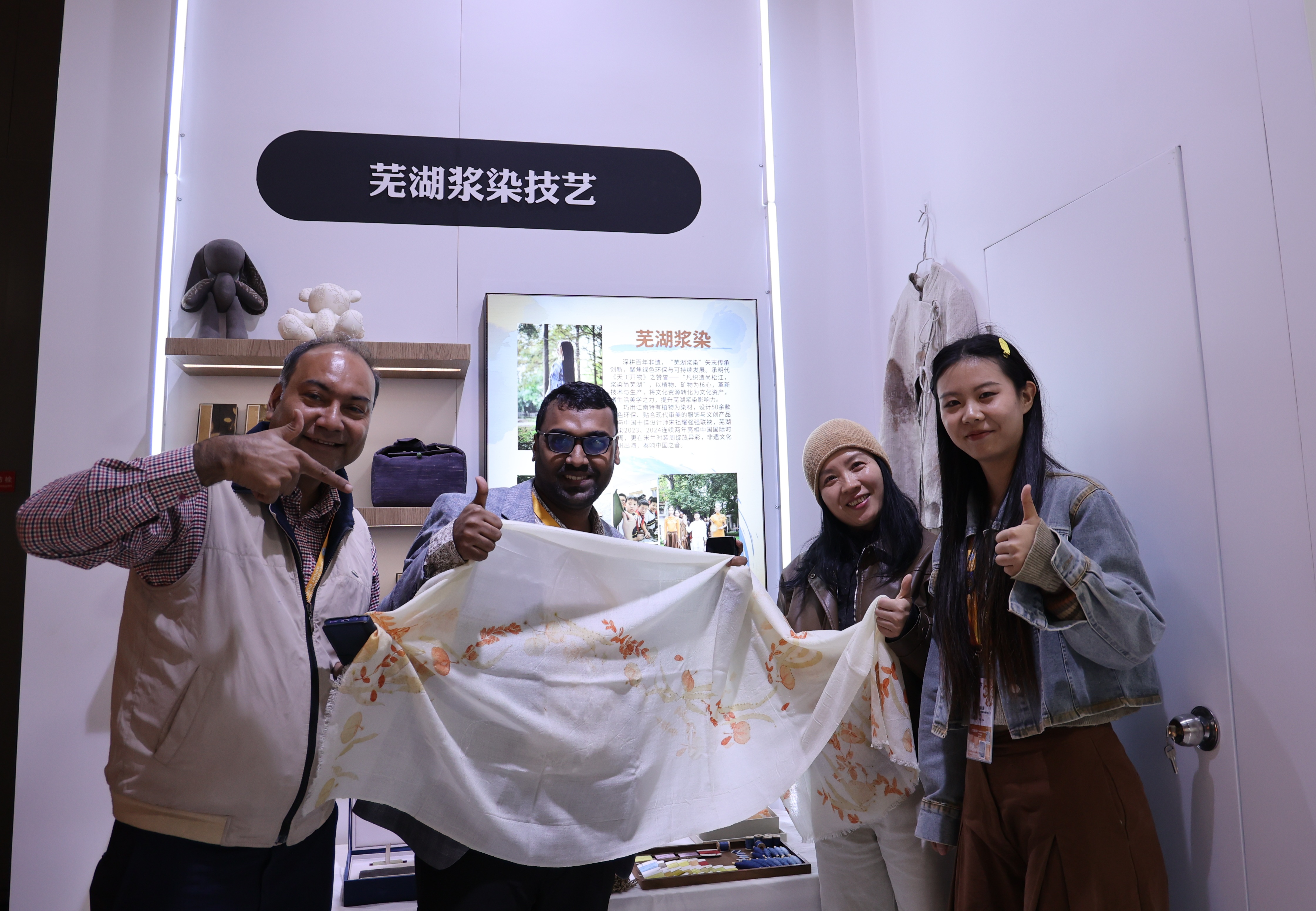 本次进博会“芜湖浆染”参展作品包含服饰、文创两大品类上百件浆染精品,是团队师生经过3个月的精心设计制作完成。参展作品不仅复原了传统技艺,更在新时代背景下,对原有染色工艺进行了革新,创新“花叶染”与“绘染”技术,让染色图案从平面走向立体,赋予了传统技艺新的生命。展会期间,众多国内外参会代表和观众纷纷来到展台前参观打卡,惊叹于非遗技艺与现代审美的完美结合与精彩呈现,进博会产品合作中心、奇瑞汽车、儒均资本、云南白沙锦绣艺术学院、瑞鲸商城等10多家单位与团队洽谈进一步合作,团队还接受了中国文化报、安徽日报、宁夏日报等媒体采访。“芜湖浆染技艺”在“进博会”国际大舞台上的亮相,不仅展示了我校在地方非物质文化遗产创造性转化、创新性发展方面开展的扎实工作,也展现了我校产教融合、科教融汇的丰硕成果,极大地提升了学校知名度。