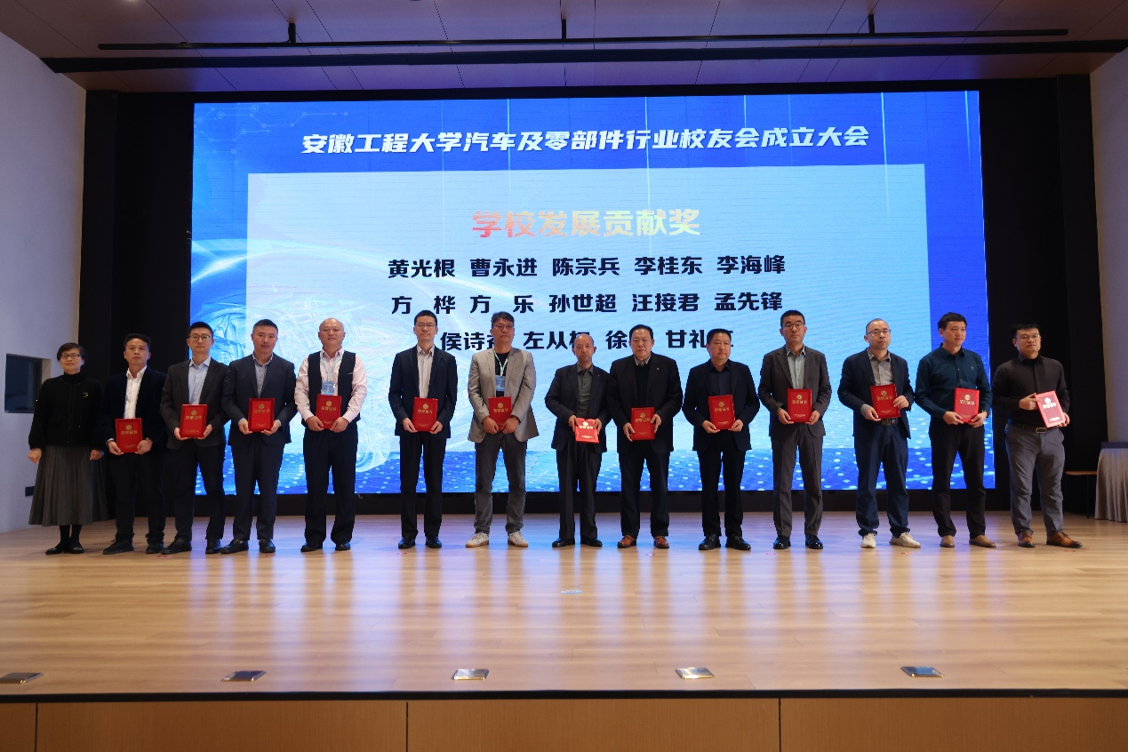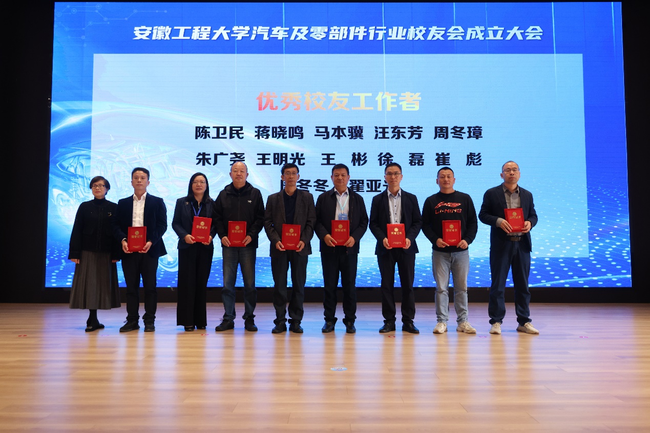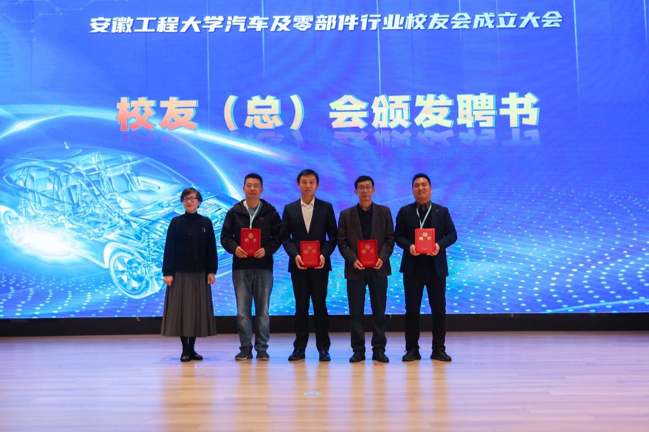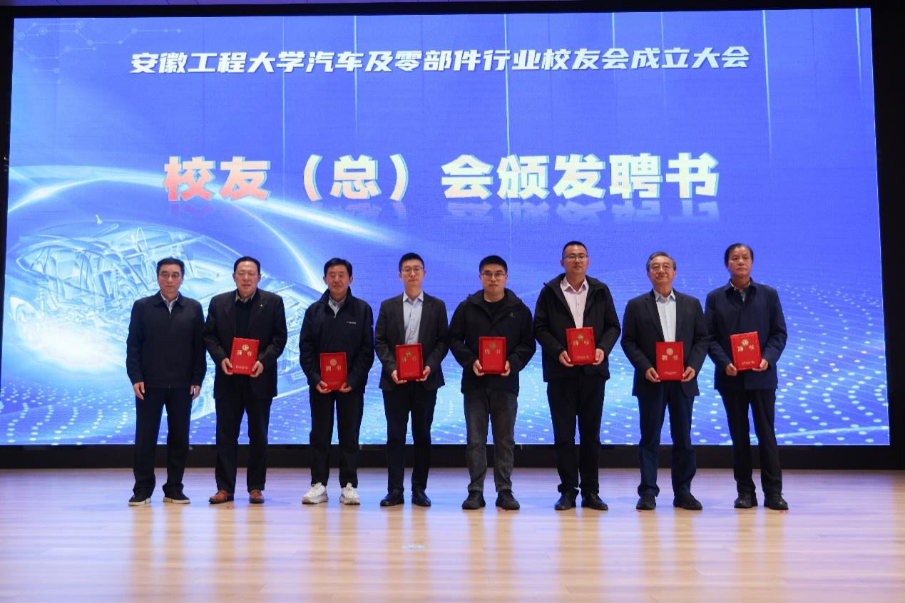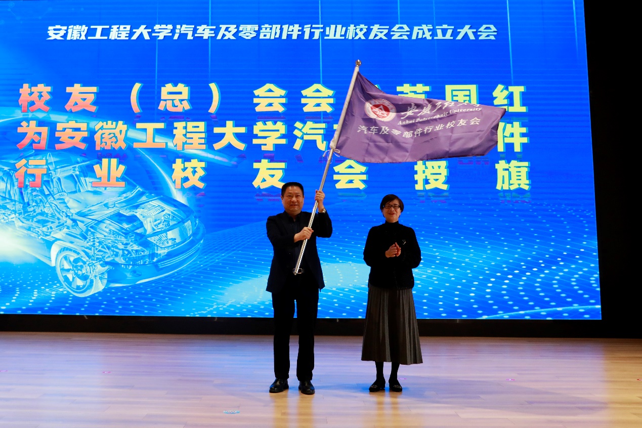 校友会副会长兼秘书长陶玉贵宣读了《关于同意汽车及零部件行业校友会成立大会的批复》。大会表决通过了机构负责人名单。郑健、苏国红、滁州市康达叉车零部件制造有限公司董事长黄光根、安徽金诚车辆工程有限公司董事长孟先锋共同为汽车及零部件行业校友会揭牌。苏国红为校友会授旗。郑健、苏国红、刘金斌、陶玉贵共同为行业校友会新任会长孟先锋以及其他理事颁发聘书。孟先锋发表任职演讲,陈卫民、汪国春代表地方校友会致贺词。