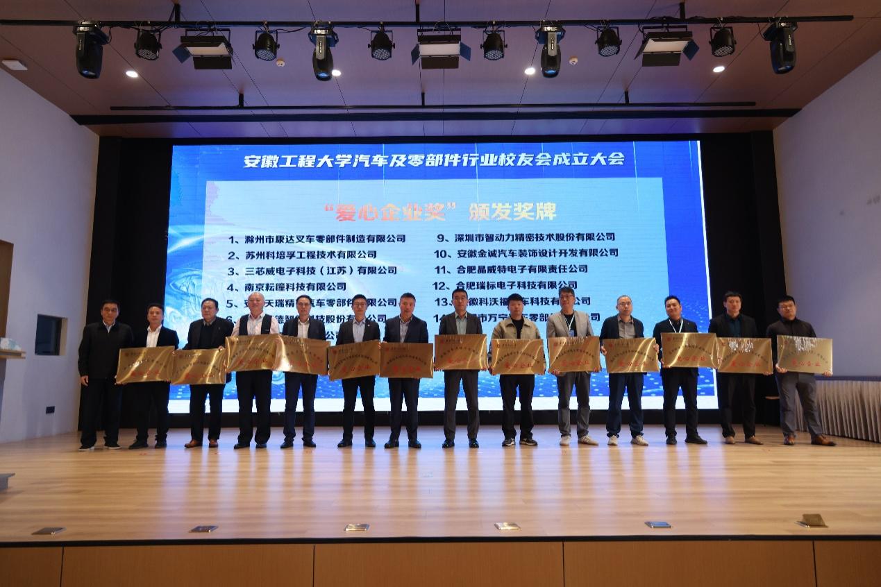 苏国红为优秀校友工作者、学校发展贡献奖颁发证书,郑健为滁州市康达叉车零部件制造有限公司等14家校友企业颁发“爱心企业奖”奖牌。