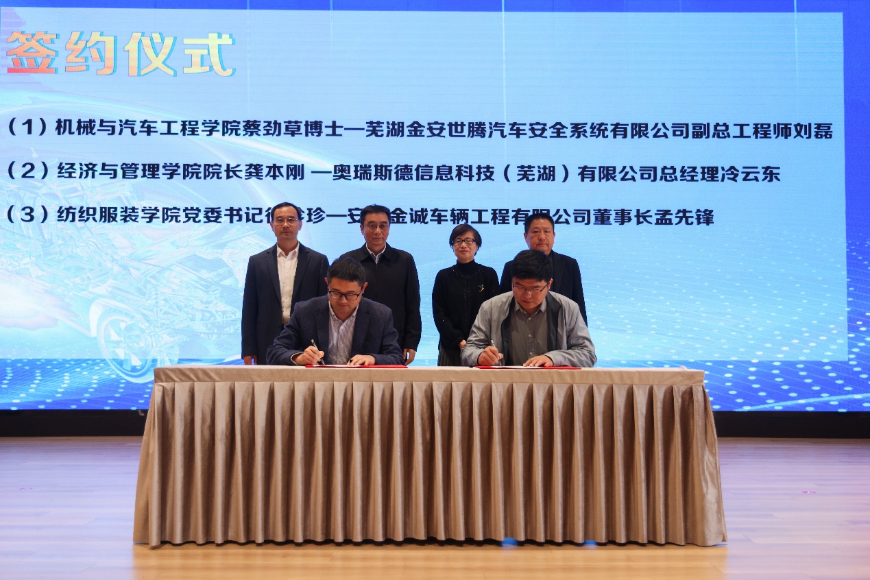 会上,机械与汽车工程学院、经济与管理学院、纺织服装学院分别与芜湖金安世腾汽车安全系统有限公司、奥瑞斯德信息科技(芜湖)有限公司、安徽金诚车辆工程有限公司签订校企合作协议。