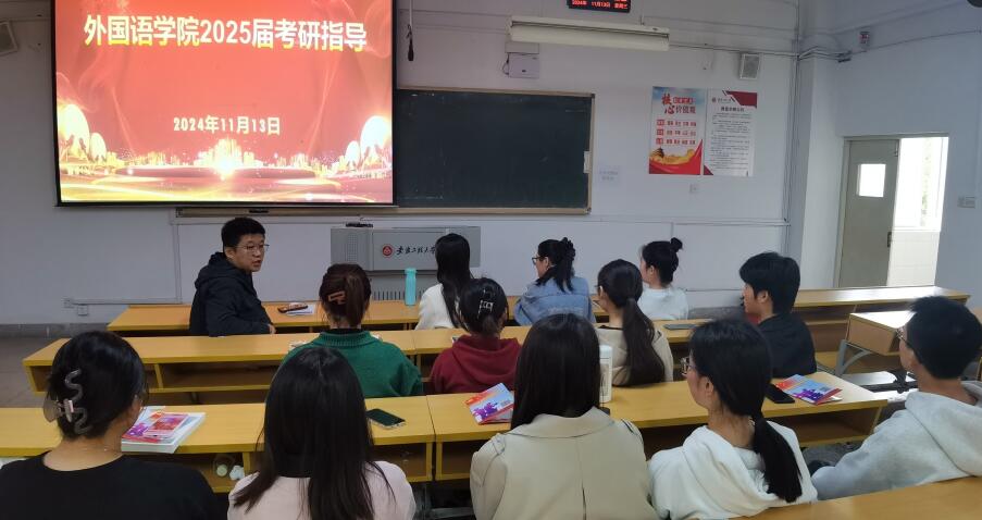 本网讯 为帮助2025届毕业生更好规划未来,明确就业方向,11月13日,外国语学院在4教213举办“筑梦之路 师长护航”考研指导暨征兵动员会。省级优秀教师、省级卓越教学新秀朱琪,省级教坛新秀苏涛,校武装部赵成婧应邀为学院2025届本科毕业生做专题指导。