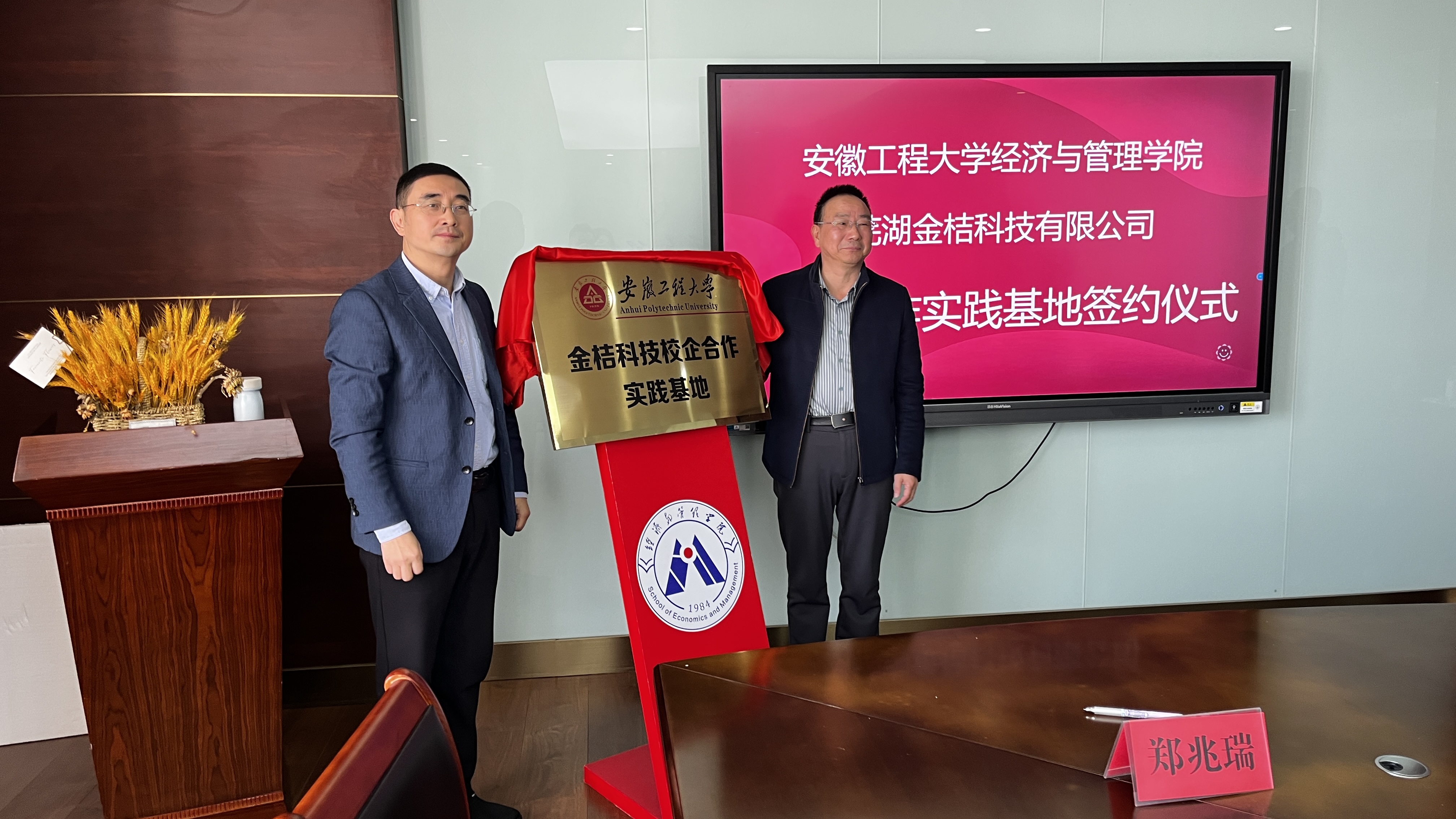 龚本刚与郑兆瑞共同签订了《安徽工程大学经济与管理学院——金桔科技有限公司校企合作实践基地合作协议》。