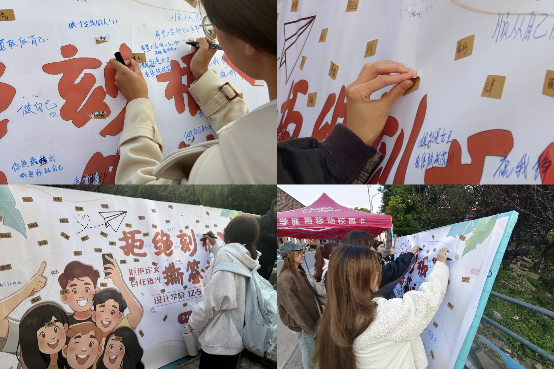在撕签活动中,设计学院通过展板上的标签,引导同学们审视那些曾经被随意定义的自己。同学们庄重地扯下触动心灵深处的标签,仿佛摆脱了束缚,重获自由。他们纷纷用便利贴写下激励人心的字句和对未来的憧憬与向往,贴在展板上。这次活动不仅让同学们明白了不要被标签轻易定义,更鼓励他们勇敢地面对内心的恐惧和外界的偏见,活出真实、自由的自己。