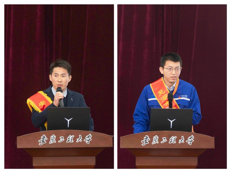 本次活动以劳模工匠深入思政课堂的形式开展,紧扣“弘扬三个精神,放飞青春梦想”主题和《思想道德与法治》相关章节内容,实现理论与实践的相互结合。“全国五一劳动奖章”获得者、“安徽省劳动模范”、安徽华能电缆集团有限公司技术部经理肖尚浩,“芜湖市十大杰出青年”“芜湖市五一劳动奖章”获得者、冶金博士、芜湖新兴铸管有限责任公司炼铁部副部长魏瑞瑞,以其亲身经历,为400多名大一新生讲授了一堂生动的思政大课。
