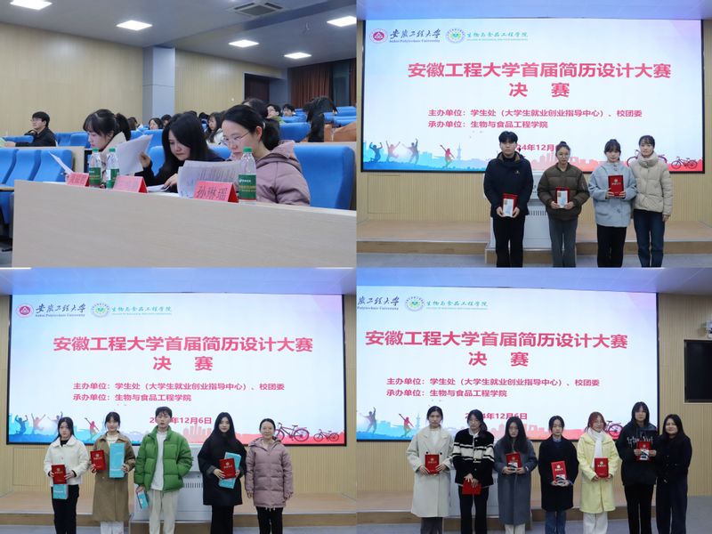 本网讯 12月6日,由我校学生处(大学生就业创业指导中心)和团委主办,生物与食品工程学院承办的校首届简历设计大赛决赛在5J217教室举行。经现场评审,设计研24王君等3名同学获得一等奖,计算机拔尖221张结婷等4名同学获得二等奖,人力231许雅晨等5名同学获得三等奖,营销221巫勤雯等8名同学获得优秀奖。