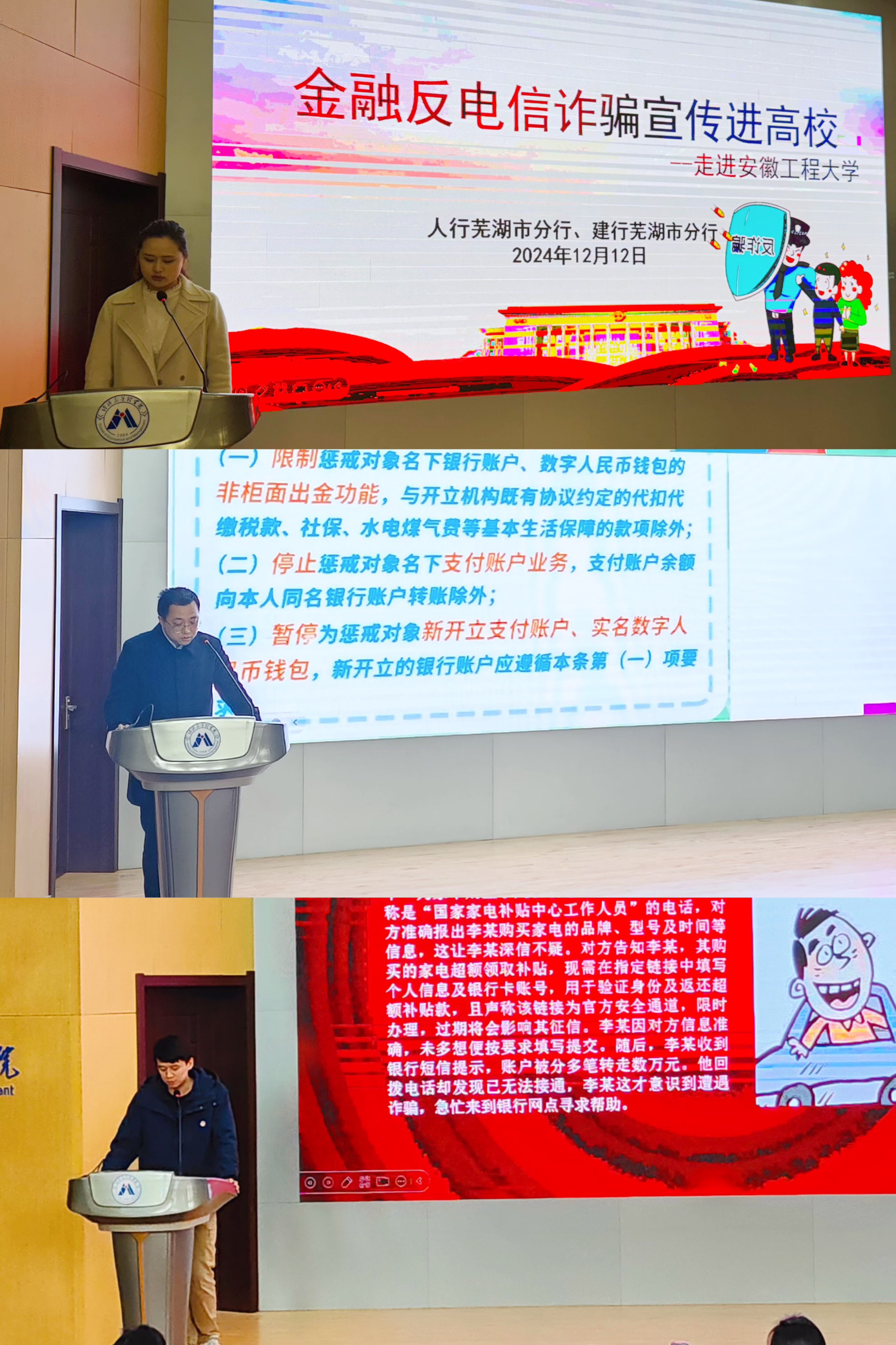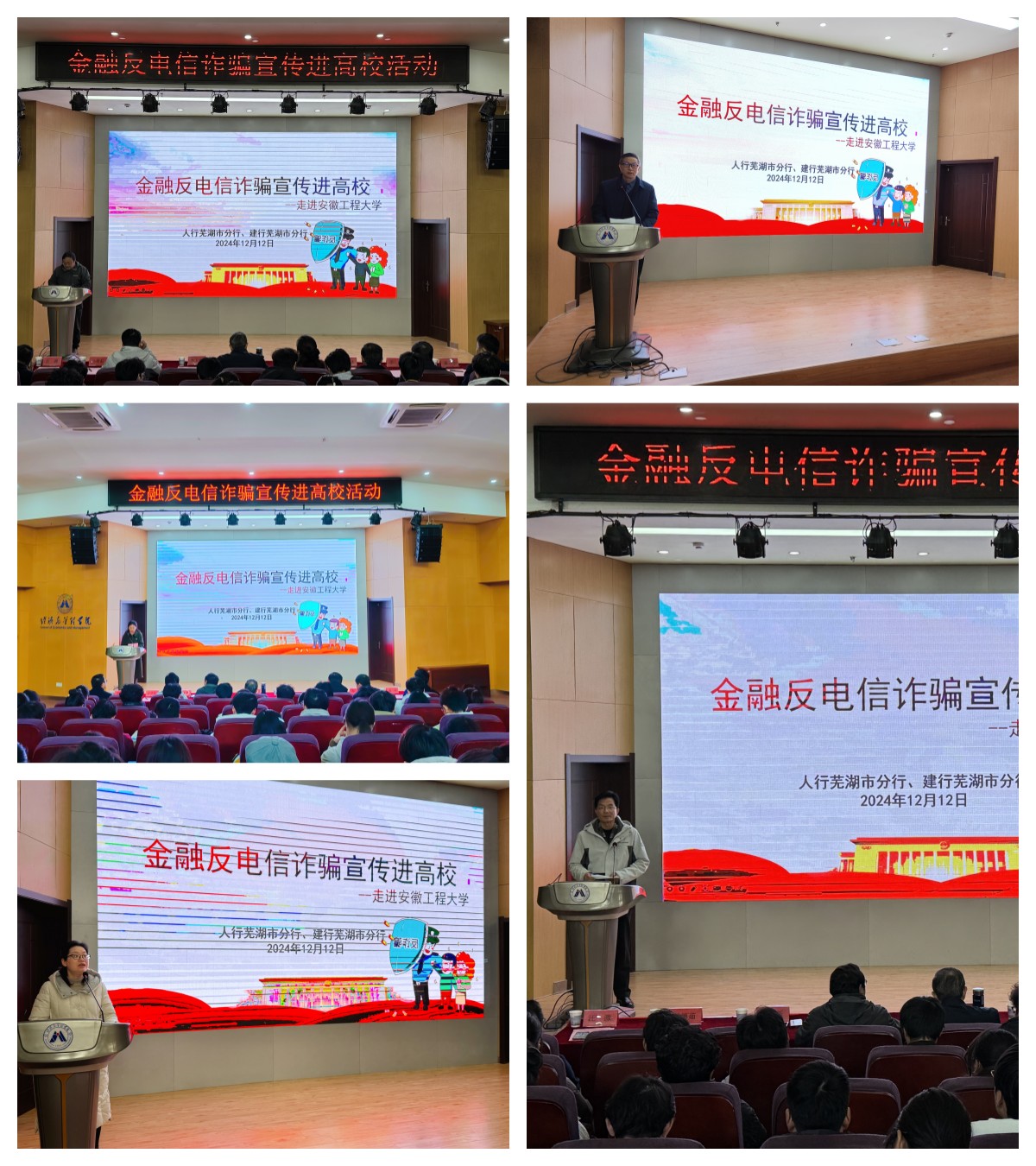 本网讯 为提高大学生的金融风险防范意识,增强学生“识诈反诈”意识和能力,12月12日,计算机与信息学院与中国人民银行芜湖市分行、中国建设银行芜湖市分行联合开展“金融反诈宣传进高校”专题宣讲活动。中国人民银行芜湖市分行领导刘军、中国建设银行芜湖市分行副行长汪庆、校保卫处处长文才新、校学生处处长黄炜、学院党委书记李卫东、党委副书记孙德茹,中国人民银行芜湖市分行、中国建设银行芜湖市分行相关负责人以及学院辅导员代表、学生代表参加活动。