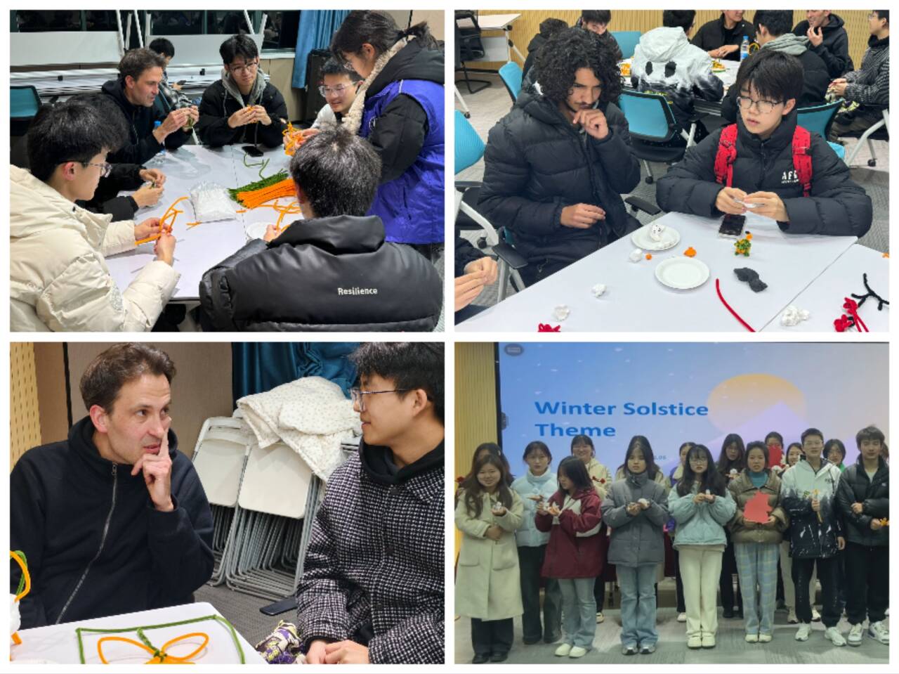 中外话“团圆”,如意促和谐。为进一步加强中外文化交流,12月6日举办的“口语广场-英语角”热场活动,以冬至这一传统节日为主题,成功将中国传统文化与英语学习巧妙地融合在一起,为参与者带来了一场别开生面的文化盛宴。热场活动中,中国学生与来自英国的外籍教师Michael以及来自摩洛哥的留学生Omar、Nasir围坐在一起,一边体验传统剪纸和扭扭棒手工制作,一边用英语亲切地向他们介绍冬至的传统习俗。他们讲述了冬至的历史由来、吃饺子和汤圆的传统寓意,以及家家户户团聚一堂共度佳节的温馨场景。外教和留学生们兴奋地在中国学生的指导下制作手工,同时他们还积极提问,了解更多关于冬至和中国传统文化的细节。不到半个小时的时间,梅花、柿子、十二生肖等图案的手工制品顺利完成,中外师生一同拿起自己亲手制作的手工合影留念。