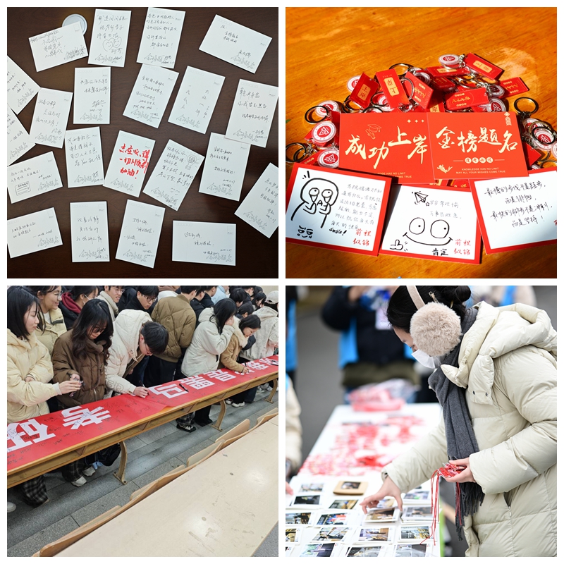 用浩浩之力,做好服务保障。校领导深入学生宿舍与复习场所,实地走访并与备考学生座谈,细致了解他们的学习状态及服务需求。学校面向低年级同学征集了4000多条祝福语,制作成手写明信片,赠予考研学子以资鼓励。暑期,学校开展了多轮考研慰问活动,为同学们发放防暑降温物品1200余份。学校各食堂为考研学子准备了1500余份暖心加油包。针对考研座位紧张问题,学校多部门协调联动克服重重困难,提供了近千个专属考研座位。各学院精心挑选慰问品,温情开展慰问活动,已累计赠送考研慰问品2800余份,礼包由文具、暖宝宝等含有美好祝愿的物品组成。
