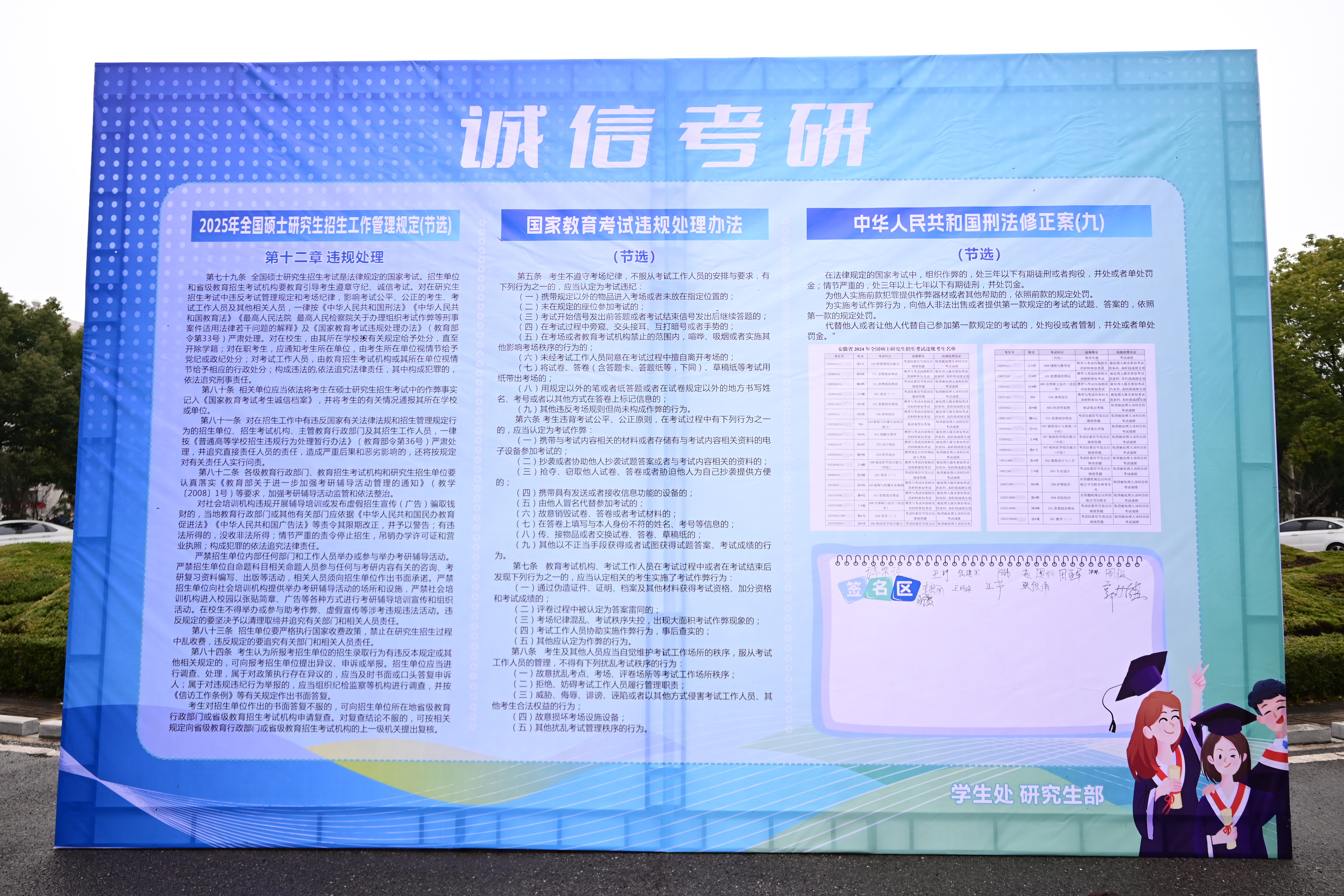 用拳拳之心,做好教育引导。学校通过举办大学生职业生涯规划、考研经验交流会、校外名师专家进校讲座等活动,引导学生树立以未来出路为导向的学习目标,指导同学们精心规划考研之路,助力学生成长成才。在考研的各个关键节点,学校通过新媒体平台编发温馨提醒,开展多轮研究生考试诚信教育活动,切实增强了考生遵纪守法、诚信应试的意识。各学院于考研初期积极帮助学生规划考研之路。计算机与信息学院、外国语学院组织考研形势分析大会与考研主题班会,邀请考取研究生的同学回到课堂,与备考学子面对面交流,答疑解惑;纺织服装学院、化学与环境工程学院邀请专业课老师入驻“一站式”学生社区分享经验与方法;机械与汽车工程学院、设计学院举办考研经验分享会,邀请成功上岸的往届学生讲述备考历程与心得;数理与金融学院以诚信促学风,严格执行管理制度,狠抓诚信教育。
