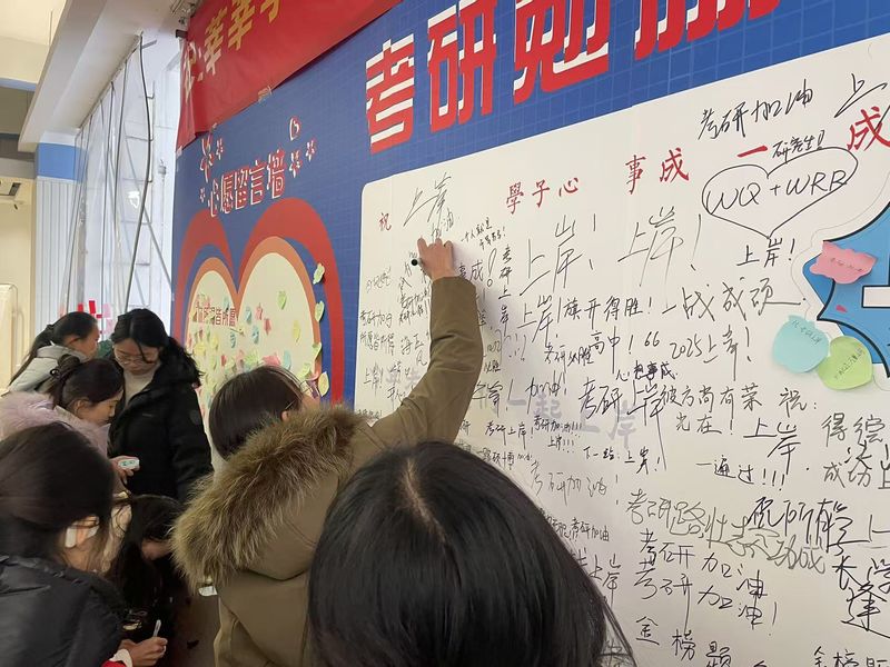 “研”途有梦,一“录”有你。送冬日“研”途暖阳,做温暖情怀食堂,研究生备战和应考期间,各食堂精心准备了形式不一的送祝福活动,祝愿每一位心怀梦想的考研学子在考研之路上取得佳绩,书写人生新的辉煌篇章。东区食堂在考试期间为考研学生设置了免费专属窗口,考试前还为考研学子们送上了饱含祝福的“大礼包”;二食堂为考生精心准备了“心想‘柿’‘橙’”祝福礼盒和卡片;三食堂准备了精美礼物和“一战成硕 金榜题名”加油包;四食堂准备了主题为“菁菁学子 成功上岸”的考研送祝福系列活动。考试期间,食堂还精心制作了萝卜排骨汤、海带骨头汤,免费供应,他们用实际行动,助力和祝福考研学子金榜题名。各食堂还设置了“考研勉励墙”,考研学子纷纷留下了为自己和同窗们加油呐喊的祝福,拍照留影,见证每一个感动瞬间。