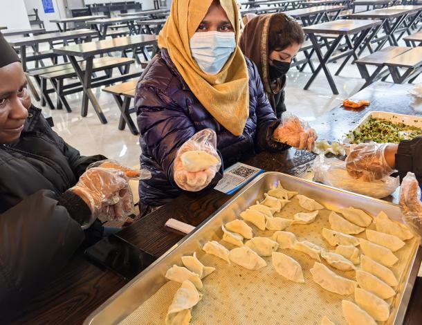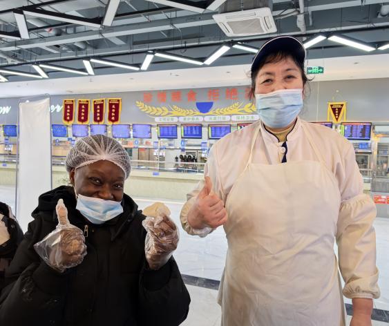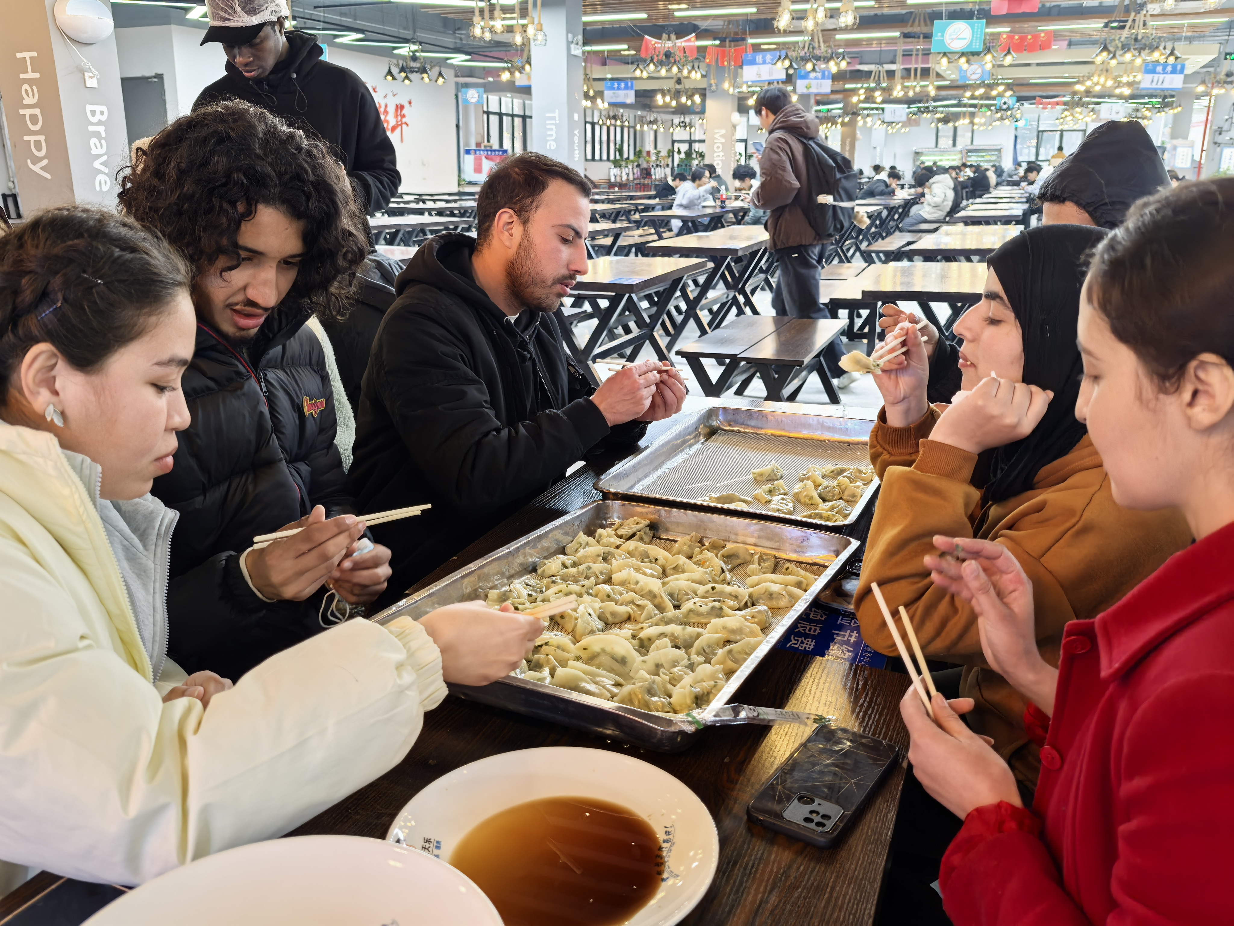 活动现场,食堂的专业面点师傅们亲自上阵,指导留学生们学习如何包饺子。师傅们手法娴熟,将一张张饺子皮填上馅料,捏出漂亮的褶皱,引来留学生们的阵阵惊叹。在师傅们的耐心指导下,留学生们也纷纷动手尝试,从最初的生疏到逐渐熟练,每个人都沉浸在这项传统技艺的乐趣中。经过一番努力,一盘盘形状各异、却满载心意的饺子呈现在大家面前。这些饺子被送入厨房煮熟,留学生们品尝着自己亲手制作的劳动成果,脸上洋溢着满足和喜悦的笑容。