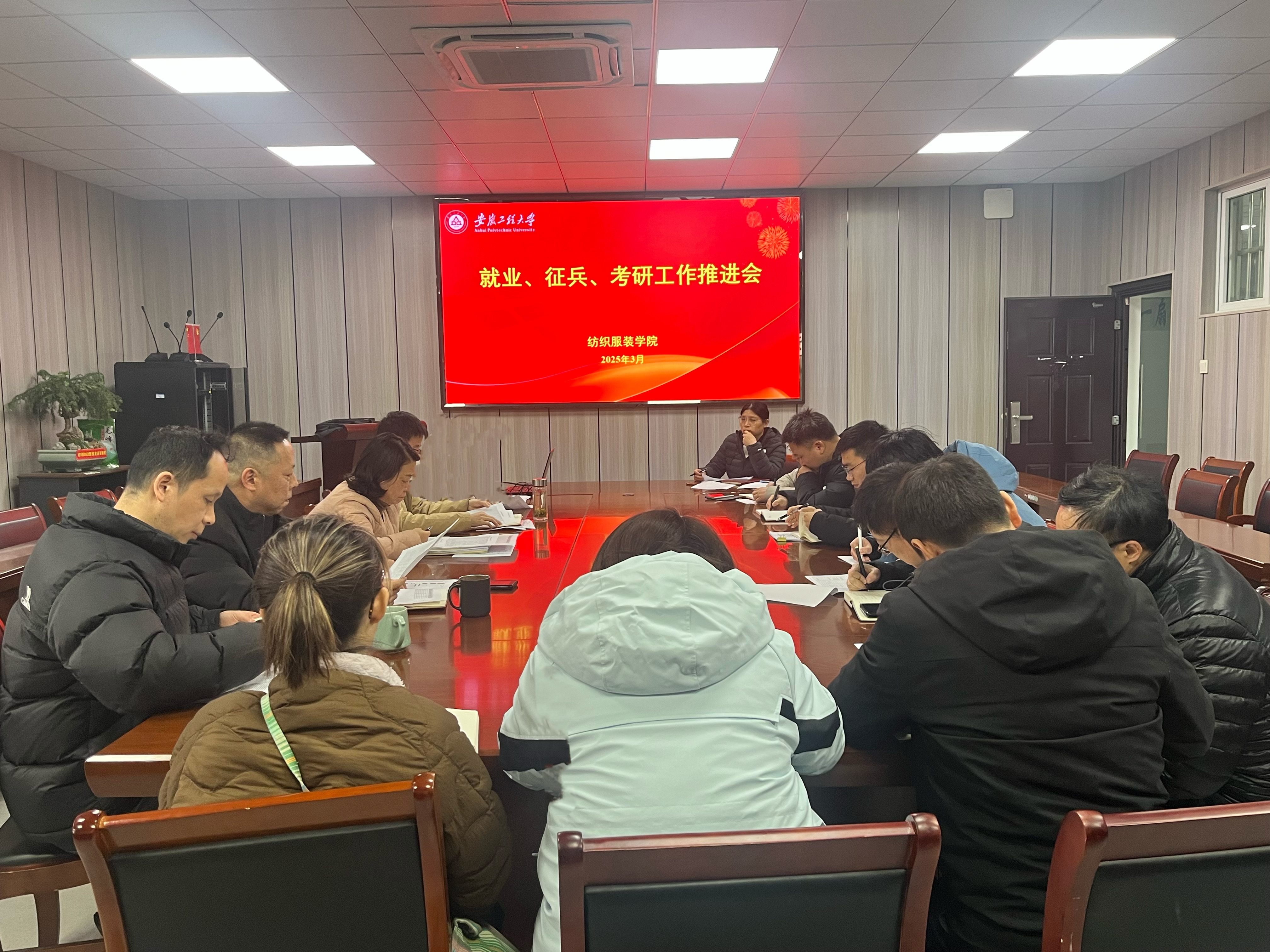 本网讯 3月5日,纺织服装学院在学院会议室召开2025届毕业生就业、征兵、考研工作推进会。学院党委书记徐珍珍、院长李长龙、副书记梁雪松、副院长陶旭晨、各系主任、系副主任、支部书记、支部副书记及毕业班辅导员参加会议。