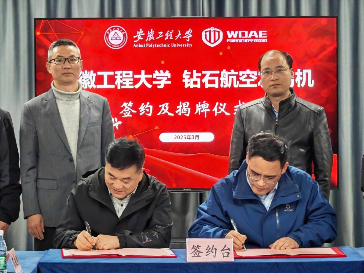 本网讯 3月31日,机械与汽车工程学院院长王建平一行赴芜湖钻石航空发动机有限公司开展研究生实习实践基地建设和产学研对接等活动,双方举行了基地揭牌仪式、项目签约仪式。公司总经理郑君、副总经理胡崇波代表公司签约,产业研究院负责人和项目负责人出席了本次活动,湾沚区汽车零部件协会秘书长欧邦南受邀出席并见证了整个过程。
