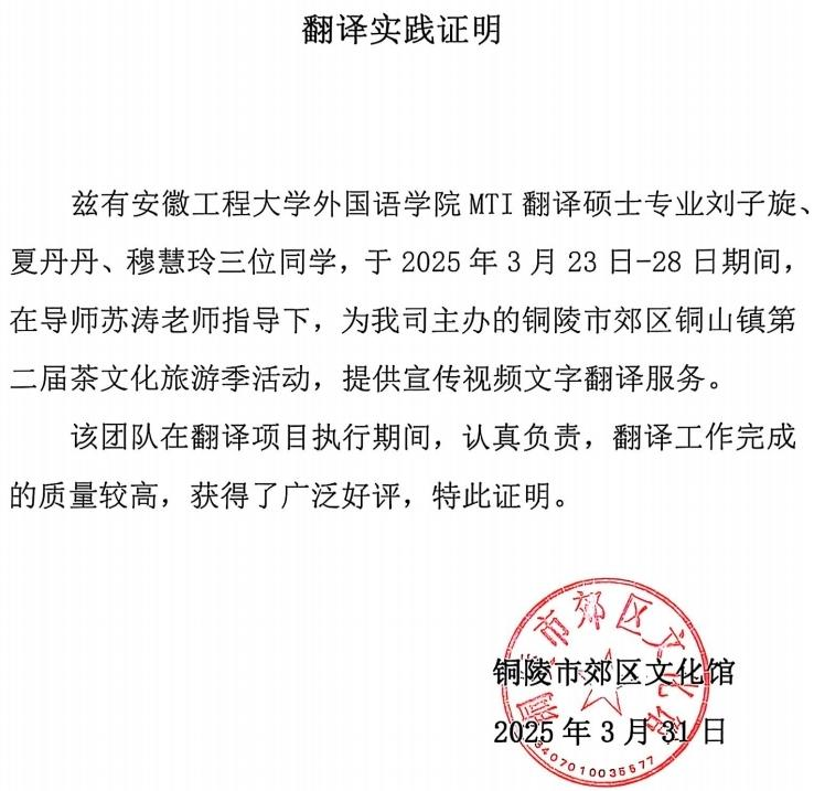 本网讯 4月1日,铜陵市铜山镇第二届茶文化旅游季活动盛大开幕,活动中的宣传视频以高质量的英文翻译,收获了国外游客的称赞。而这一成果,离不开外国语学院翻译团队的努力。翻译专业硕士24级学生刘子旋、夏丹丹、穆慧玲,在导师苏涛副教授的悉心指导下,承担并圆满完成了此次宣传视频的文本翻译项目。
