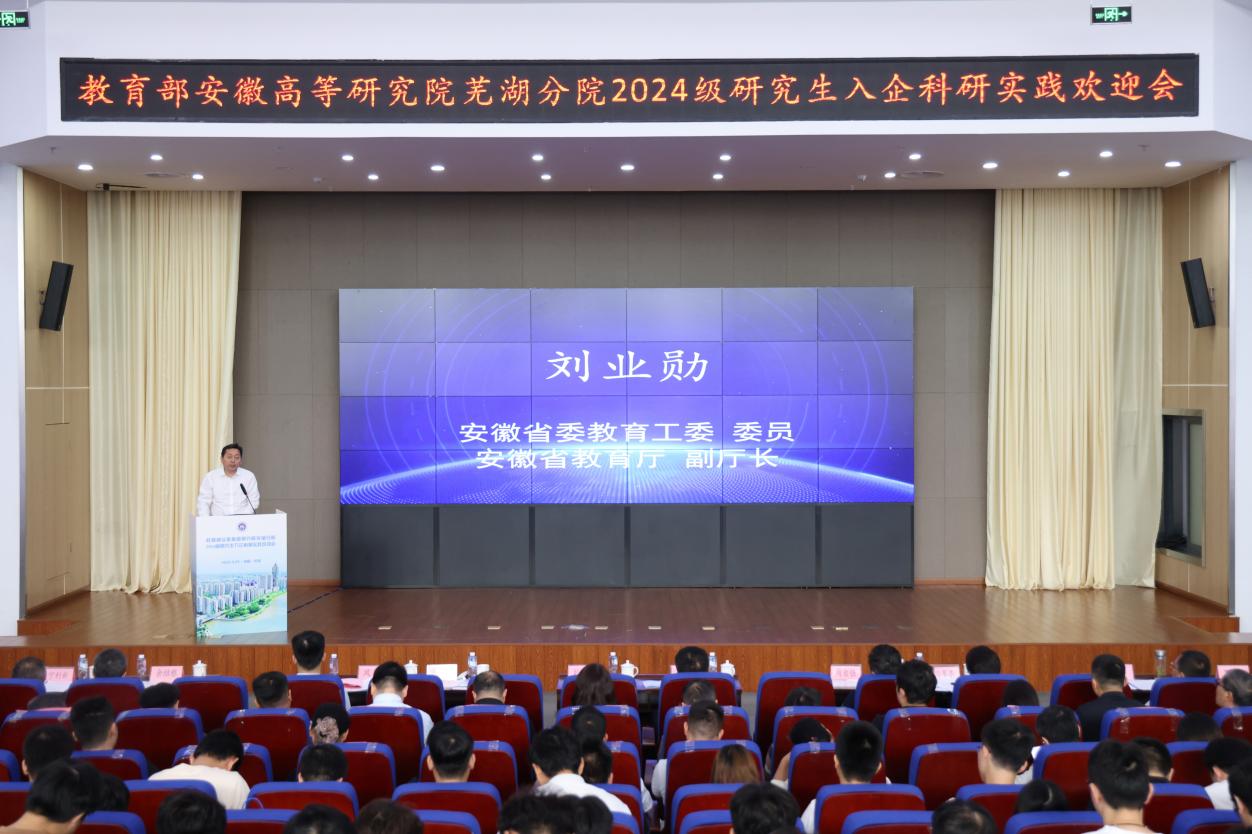本网讯 9月28日,教育部安徽高等研究院芜湖分院2024级研究生入企科研实践欢迎会在我校图书综合楼五楼报告厅举办。安徽省委教育工委委员、省教育厅副厅长刘业勋,芜湖市人民政府副市长朱子,校党委书记卢平,校党委常委、副校长凤权出席会议。在芜高校和省外合作高校有关负责人,导师代表,部分市直单位、我校相关部门负责人,安徽高等研究院芜湖分院2024级入企研究生参加。