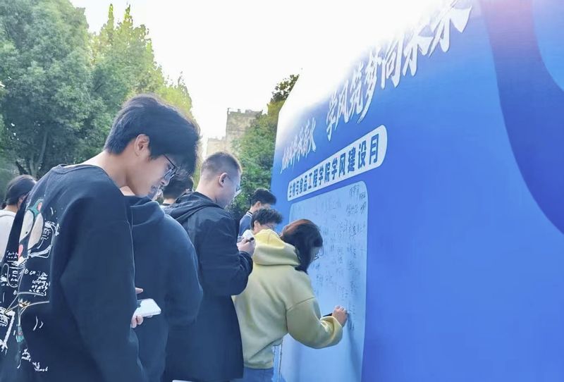 活动期间,生物与医药专业2025级研究生刘鑫鑫结合本校升学经历,从复习方法与心态调整两方面分享了备考心得。来自各年级的200余名师生代表共同参与活动,并在学风建设承诺签名墙上郑重签名,表达了积极投身优良学风建设的共同决心。
