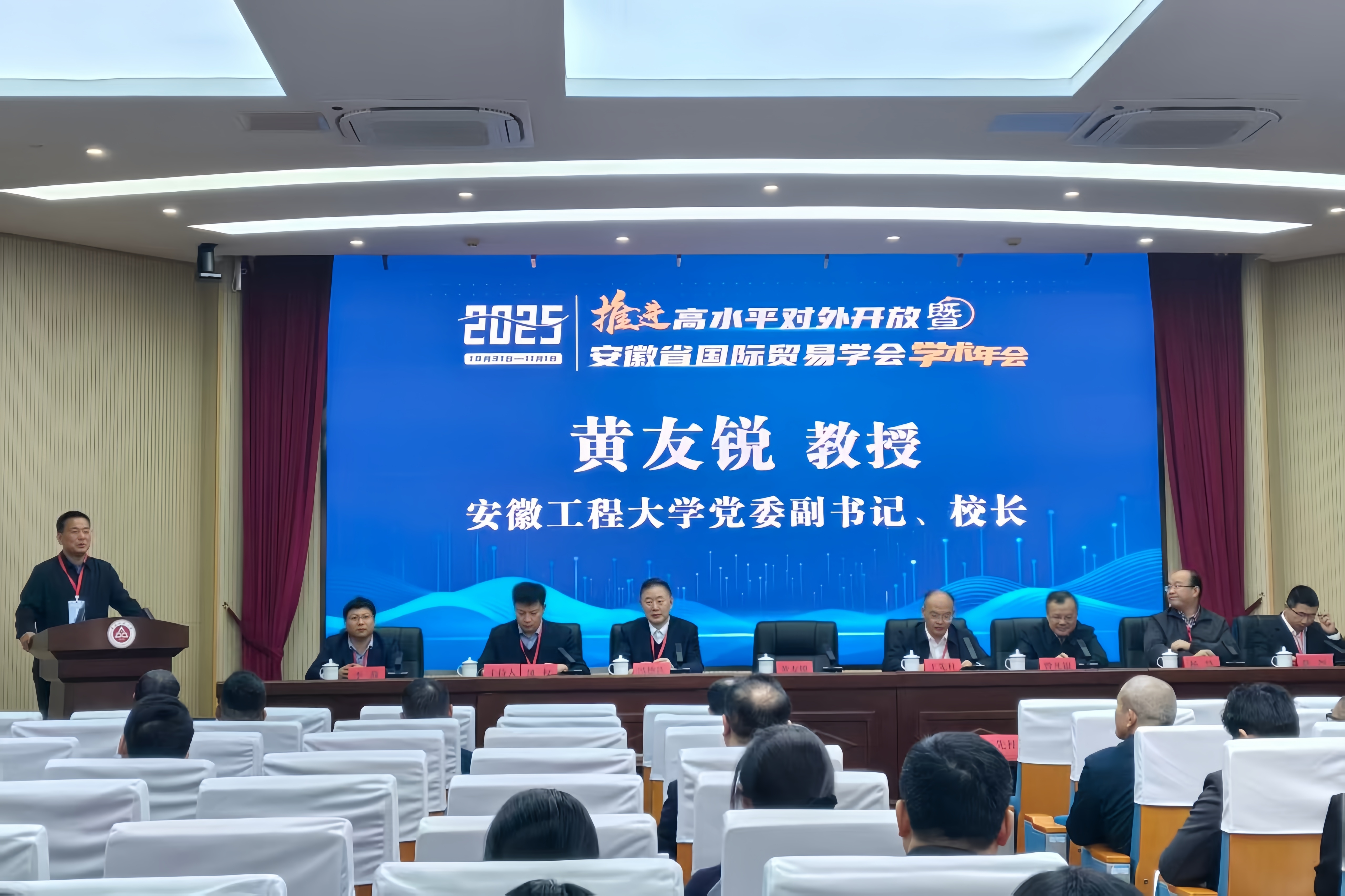 本网讯 10月31日至11月1日,由安徽省国际贸易学会、安徽工程大学主办,安徽工程大学经济与管理学院、安徽工程大学青年社科学者协会承办,安徽三联学院协办的推进高水平对外开放暨2025年安徽省国际贸易学会学术年会在我校举办。校党委副书记、校长黄友锐,安徽省国际贸易学会会长冯德连,安徽省社科院原院长、党组书记曾凡银,池州学院党委副书记、校长王先柱,我校党委常委、副校长凤权出席开幕式。开幕式由凤权主持。