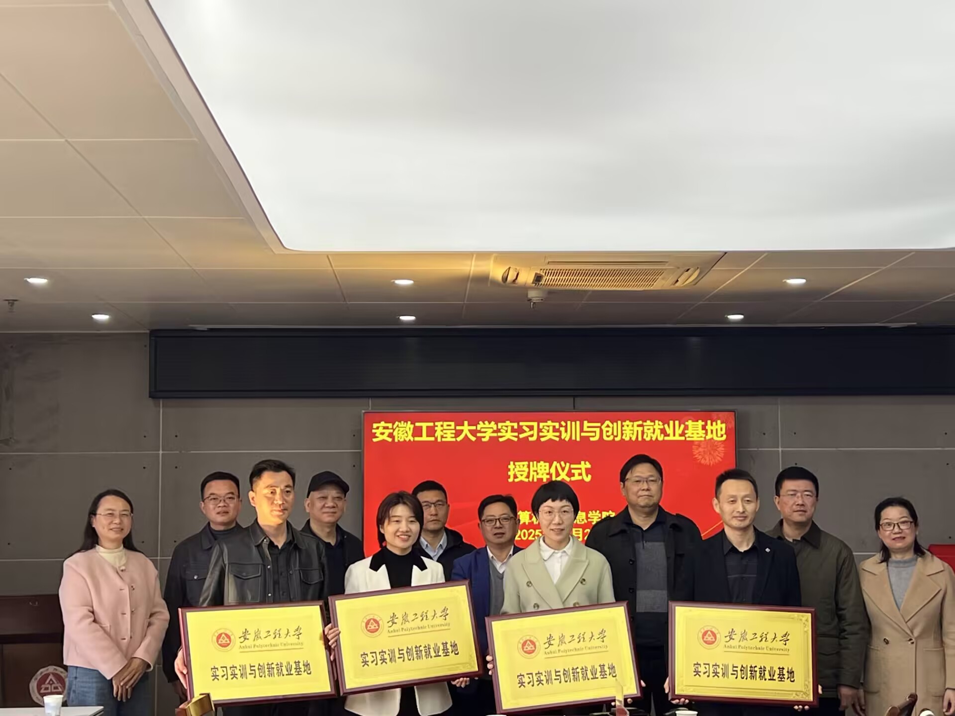 刘涛、孙德茹分别介绍了学院人才培养情况、招生就业工作。刘涛与伯泰克汽车电子(芜湖)有限公司人事经理谢杨、安徽中充服物联网科技有限公司总经理张婷、芜湖金安世腾汽车安全系统有限公司副总经理王辉、芜湖易来达雷达科技有限公司总经理助理孙健等企业代表签署“安徽工程大学实习实训与创新就业基地”校企合作协议并授牌。钱帮贵向学院授“鸠江区计算机与信息技术人才培养基地”牌匾。