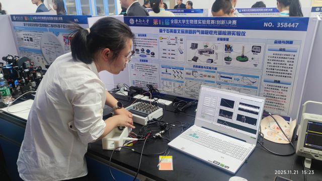 本届决赛由中南大学承办。作为国内物理类竞赛中挑战性与影响力双高的标杆赛事,共吸引了全国331所高校的3260支队伍参与预赛角逐,最终750支优秀代表队脱颖而出晋级决赛,竞争尤为激烈。由数理与金融学院许林广、葛强老师共同指导,吴皓月等同学组成的参赛队伍凭借创新实验项目《基于石英音叉探测器的气体吸收光谱检测实验仪》斩获全国一等奖;张刚和许林广老师共同指导,张靖敏等同学完成的作品《基于改进迈克尔逊干涉仪和创新解调算法的微小位移测量仪》,以及朱茂东和章其林老师共同指导,肖峰等同学完成的作品《基于光盘衍射特性的通用光谱仪及其无损检测应用》获得全国二等奖;葛强和孙明国老师共同指导,李媛媛等同学完成的作品《声速的测量》获全国三等奖。