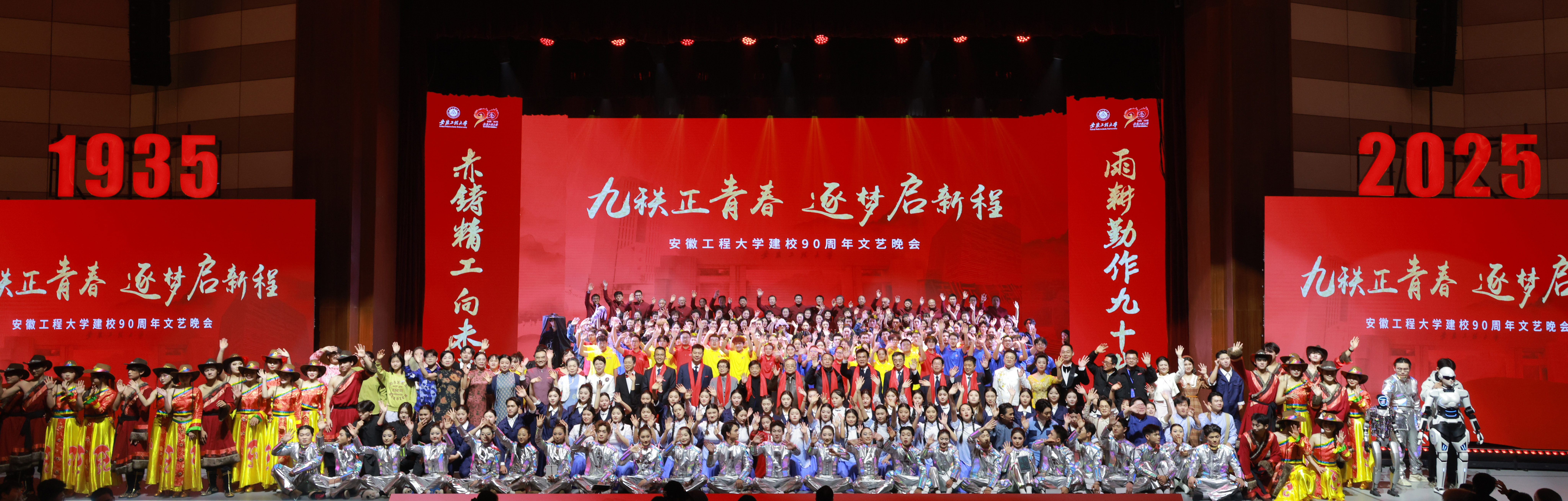 这是一曲凝聚力量的深情礼赞。情景朗诵《致敬一起走过的青春》深情回望师生相伴的岁月,各学院院旗舞动登场,引发校友阵阵回忆;服装表演《织梦安工程》展示了不同年代时尚思潮的变化与优秀校友的获奖设计成果,彰显了学校“精工勤作”的育人成效;科技舞蹈节目《智造未来》中,仿生智能机器人“安小智”与“安小瑞”的登场,生动诠释了学校在新时代面向未来、勇于创新的时代活力;主题合唱《不忘初心》《再一次出发》由离退休老教师、青年博士、学生代表组成的100人合唱团演绎,唱出了全体安工程人接续奋斗、矢志前行的共同心声。
