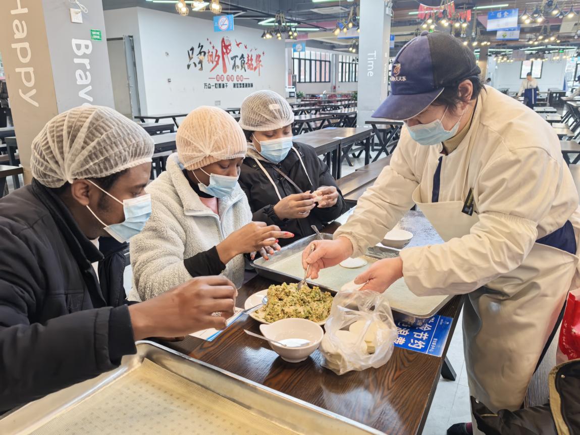 美食文化节:味蕾上的文化交流。留学生们在五食堂面点师傅的悉心指导下,尝试包制了经典馅料的饺子。从最初的笨拙尝试到后来的熟练自如,留学生们不仅掌握了元宝饺、月牙饺等传统技艺,更发挥创意,制作出了三角形、花朵形等独具特色的饺子造型。