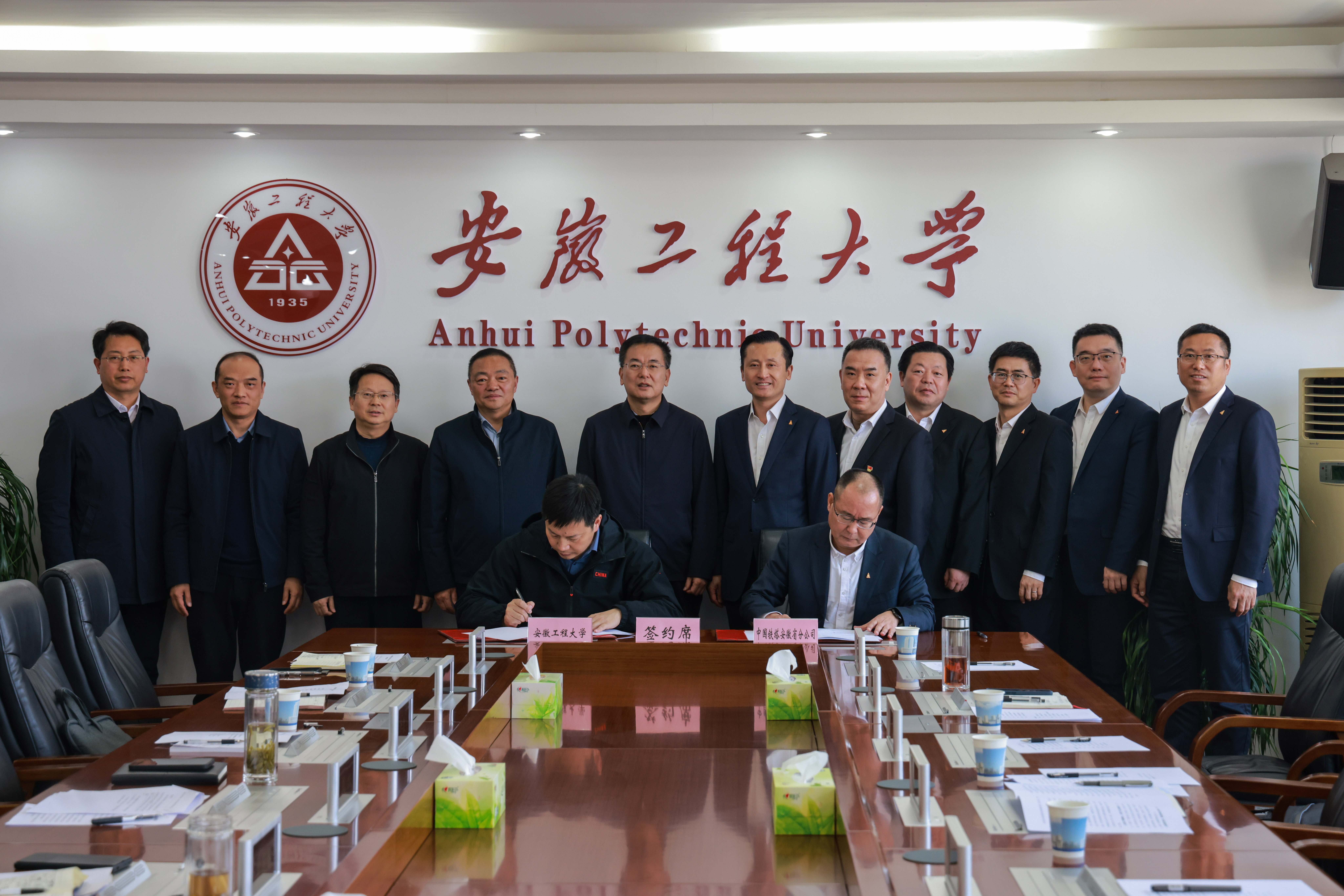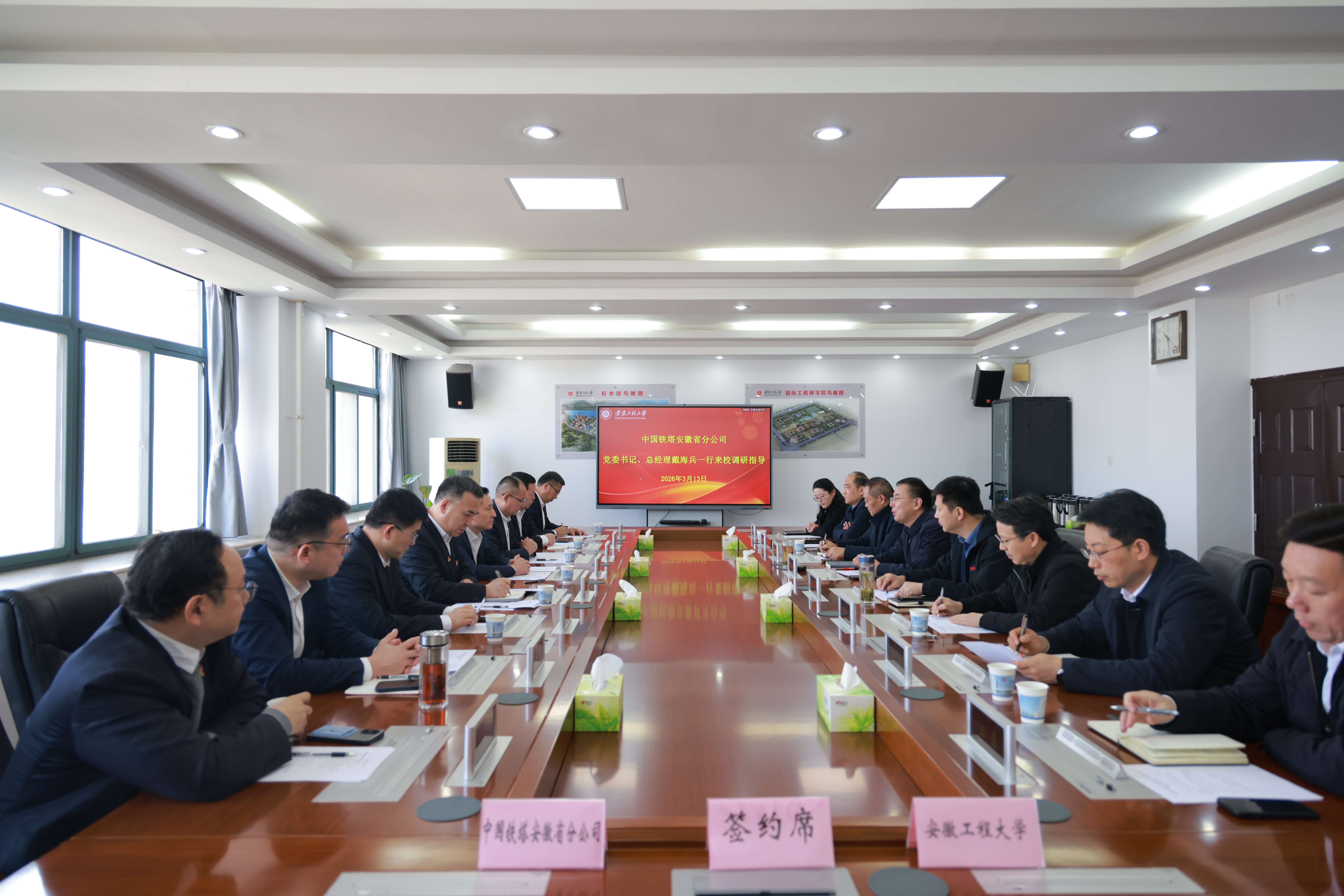 本网讯 3月13日,中国铁塔股份有限公司安徽省分公司党委书记、总经理戴海兵一行来校签订校企战略合作协议。校党委副书记、校长黄友锐,校党委常委、副校长凤权,中国铁塔安徽省分公司副总经理宋本亮出席,我校有关职能部门、学院负责人,中国铁塔安徽省分公司、芜湖分公司相关人员参加。仪式由凤权主持。