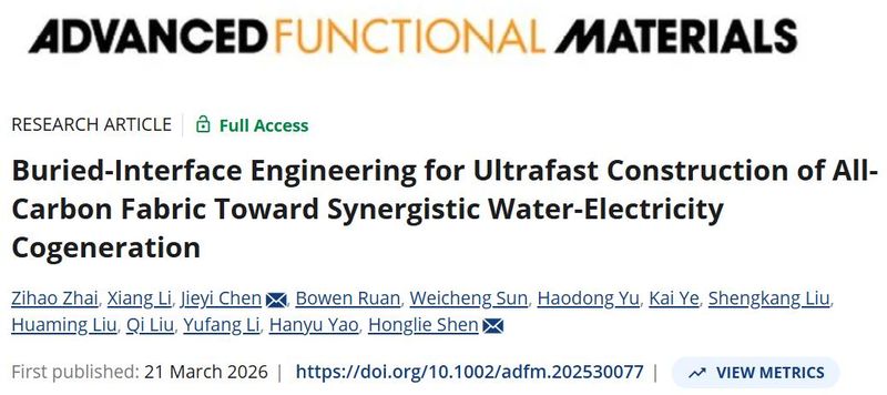 本网讯 近日,材料科学与工程学院新能源材料系青年教师翟子豪博士在材料领域国际顶级期刊《Advanced Functional Materials》(中国科学院一区Top,影响因子19)上发表题为“Buried-Interface Engineering for Ultrafast Construction of All-Carbon Fabric Toward Synergistic Water-Electricity Cogeneration”的最新研究成果。翟子豪为论文的第一作者,安徽工程大学为论文第一通讯单位。材料学院陈洁仪博士和南京航空航天大学沈鸿烈教授为论文的共同通讯作者。