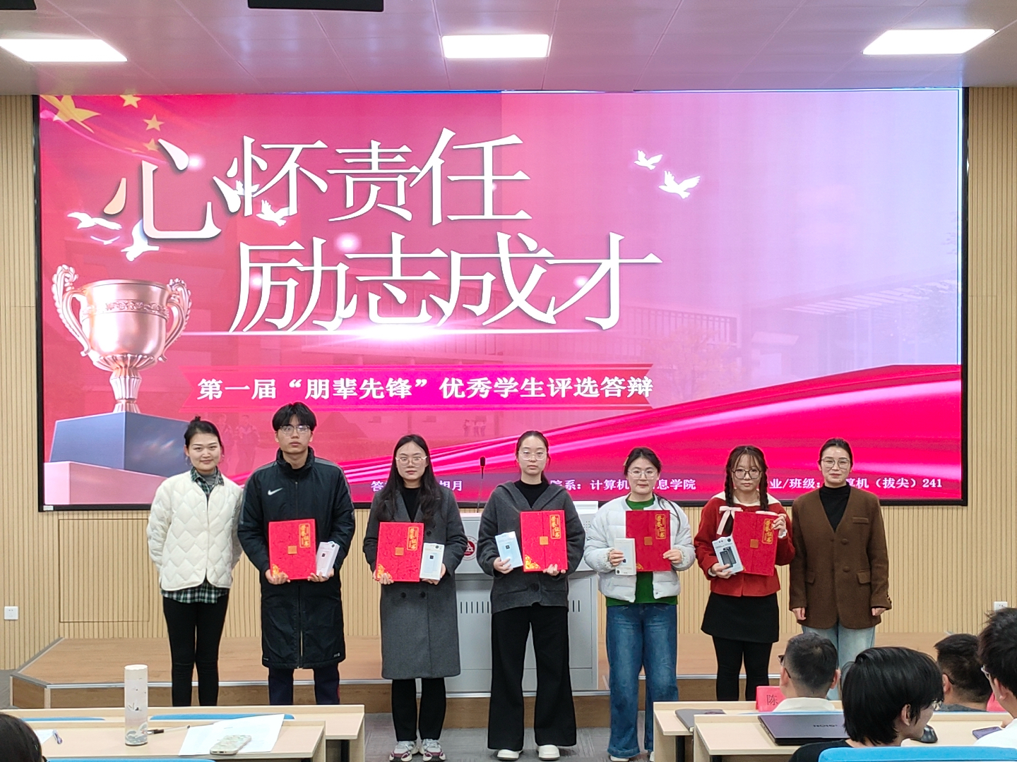 分享过程中,他们紧扣“心怀责任,励志成才”主题,结合自身成长经历、学习心得与奋斗故事,从专业学习、科技创新、社会实践、志愿服务等方面,真诚讲述奋斗历程、细致传授学习方法、积极传递青春正能量,用真实经历诠释青春担当与榜样力量,生动展现计信学子昂扬向上、奋勇争先的精神风貌,赢得现场师生阵阵掌声。现场评审小组综合评议,最终评选出李雨辰、张卓妍、辛蓝、蔡明、丁景培5位“朋辈先锋”。