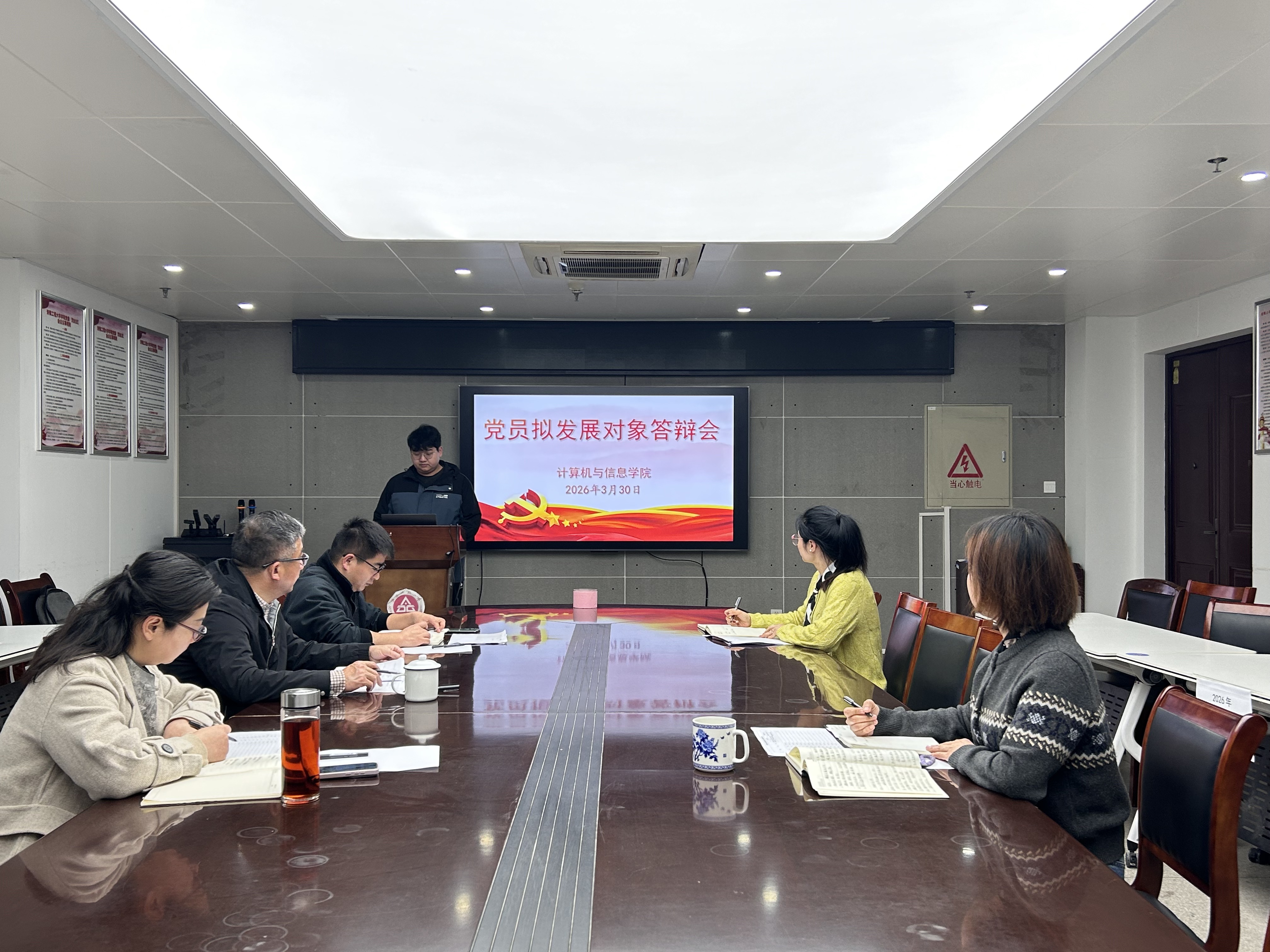本网讯 3月30日,计算机与信息学院党员拟发展对象答辩会在C622会议室举行。学院党委书记李烨、副书记孙德茹、组织员、学工秘书、部分支部书记等担任评审,26名发展对象人选参加答辩。
