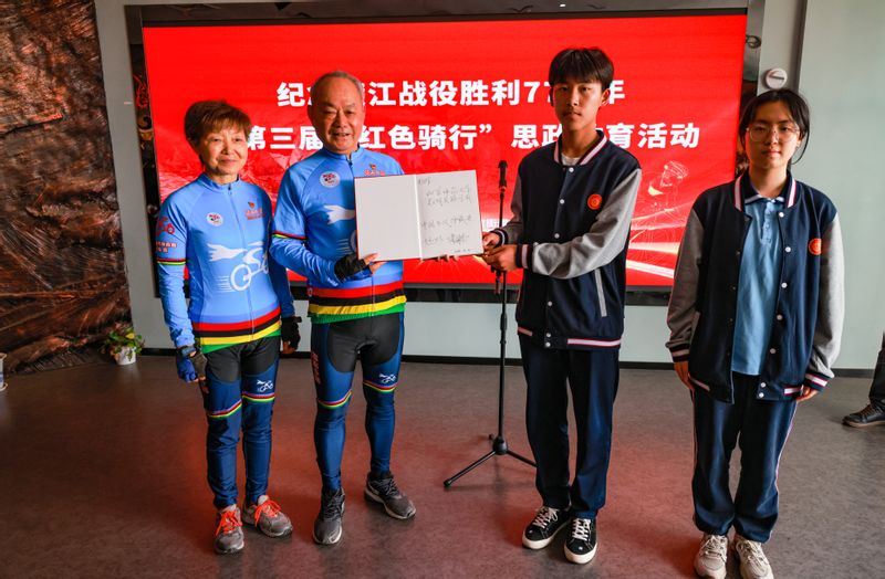 学校已连续3年开展“骑行+参观+党课”的亲历式思政教育,旨在推进思政教育走深走实、入脑入心、落地见效。此次红色骑行活动从百万雄师渡江第一船登陆点纪念碑出发,一路骑行至莲花湖公园渡江战役夏家湖登陆点纪念馆,总长约9.4公里。骑行结束后,全体成员参观了渡江战役夏家湖登陆点纪念馆。在纪念馆内,赵国庆、曹锦芬向中学生代表赠送专著《红色骑行十万里》,并讲授微党课。马克思主义学院博士孙道明开展思政课现场教学。
