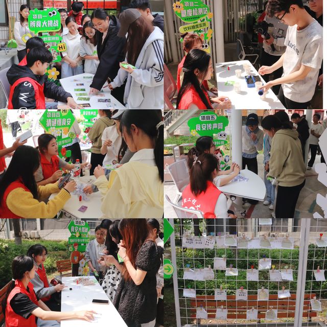 游园会紧扣学科特色,设置辨食大挑战、糖度检测站、食韵传安全、猜谜悟食安、食安传声筒、食安大揭秘、食安环保站等趣味项目。同学们手持集章卡依次闯关,在菌菇野菜的辨别中练就识物慧眼,在饮料糖度的实测中认识健康摄入标准,在诗词接龙的传诵中传递食安理念,在趣味谜语的竞猜中领悟食安知识,在你划我猜的默契中巩固食安要点,在知识分享中夯实学习成效。集齐六枚印章后,大家前往食安环保站为“变废为宝”作品投票并完成签到,即可领取由食品营养与安全协会亲手制作的小蛋糕一份。