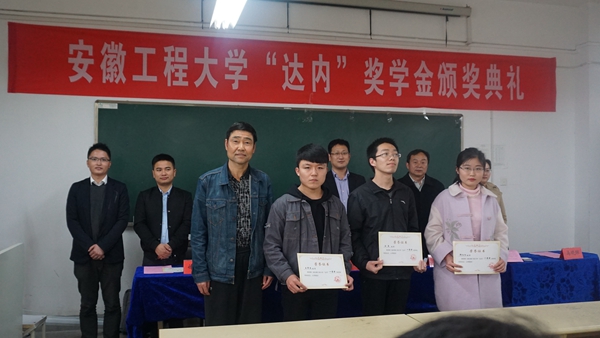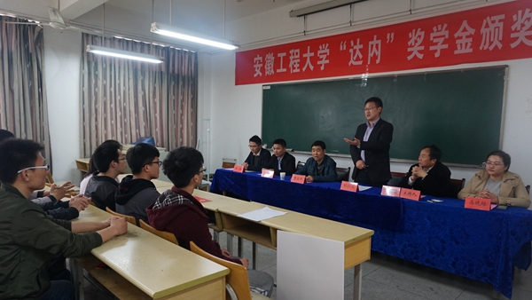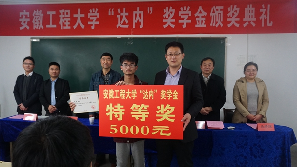 首先,曹安照宣读了第二届安徽工程大学“达内”奖学金获奖学生名单,其中特等奖1人、一等奖4人、二等奖10人、三等奖20人以及优秀奖17人。在颁奖嘉宾颁发荣誉证书之后,特等奖学金获得者王帅同学作为获奖学生代表发言。他表示:饮水要思源、知恩要图报;一定不辜负达内集团和学校以及老师们对我们的期望,努力增强自身能力,为实现中国梦做出自己的贡献。随后,达内时代科技集团代表纪仁义先生在简短介绍达内集团的现状、发展前景后,肯定了获奖者的努力与付出,鼓励他们再接再厉,欢迎这些优秀的人才到集团锻炼与学习。最后,曹安照代表学校对达内时代科技集团给予学校教育发展基金会捐助、支持教育事业发展的善行表示感谢,表示将积极按照《安徽工程大学教育发展基金会章程》、校企捐赠约定以及奖学金设立原则、标准和程序,规范操作,把让广大学生们受益、校企双赢的好事做好。