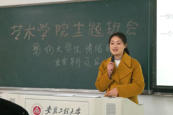 4月12日下午,艺术学院辅导员滕敏在6教110教室,为环艺141和142班学生召开以“影响大学生情绪的重要事件及应对策略”为题的主题班会。校党委书记陈其工、党委宣传部部长孙浩然和学工部副部长胡家增观看主题班会。班会结束后,陈书记进行了点评,并就班会的主题与大学生谈体会、话成长。