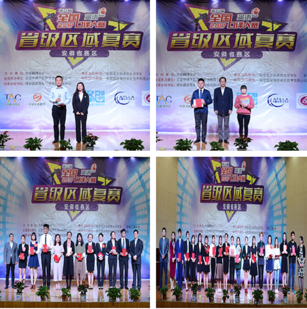经过紧张而又激烈的角逐,决赛分别决出了特等奖(即口译之星)和一二三等奖。来自中国人民解放军陆军军官学院的孙耀航通过现场机智的表现和强劲的实力斩获了安徽赛区复赛的桂冠,成为本届赛事的“口译之星”,另外来自安徽大学、安徽师范大学、安徽工程大学等十余所高校的29位选手分别获一二三等奖。这30名获奖者中,排名前20位的选手将代表安徽赛区进入五月份举行的大区赛。同时,我校荣获了中国翻译协会颁发的优秀组织单位奖。
