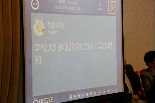 这次活动采取新媒体形式,学生通过扫码签到或回复关键词签到后,实现现场参与和在线提问同步进行,所有“签到”同学的微信头像在大屏幕上组成“我与校长面对面”标识,所提问题通过微信大屏幕呈现。