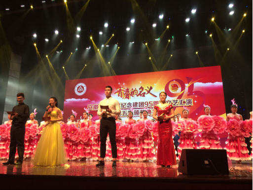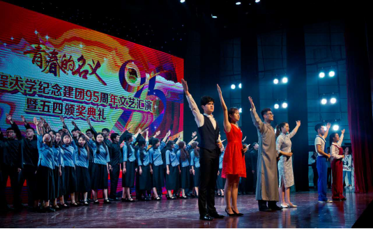 演出和颁奖典礼甫一开场,主持人就声情并茂地回顾了共青团95年的光辉历史,并响亮道出主题,“今天,我们隆重纪念建团95周年,共同瞻望我们伟大祖国灿烂美好的未来,共同抒发我校团员青年奋发有为的青春情怀。以青春的名义,让光荣与梦想汇聚成滂沱的中国力量,让青春在接力先辈们的梦想中闪光。”