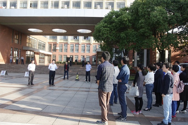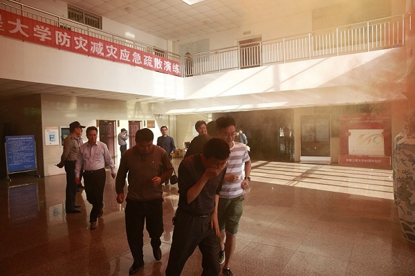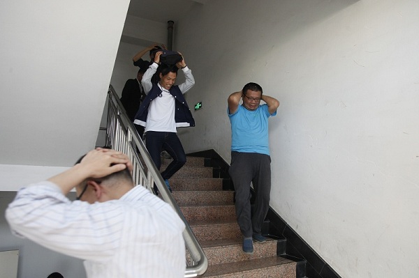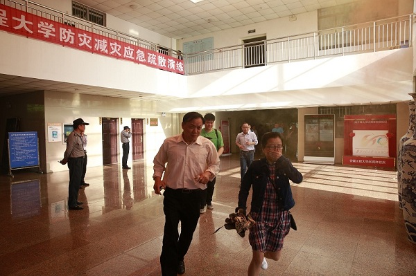 下午17:00,演练指挥长郭兴众副校长宣布演练开始,警报(长鸣)响起,应急避震演练开始,楼内人员保持镇静,室内工作人员打开办公室大门,就近躲避在办公桌下、实验台下或承重墙的墙根、墙角,用单手或其它柔软物品等保护好头部;30秒后疏散演练警报(点鸣)响起,1楼至13楼的人员开始疏散,安全疏导员在楼梯口、转角处、大门口等指定位置维持秩序,严禁使用电梯,引导疏散,一楼大厅有模拟火灾烟雾,疏散人员低身屏住呼吸或捂住口鼻,防止烟雾吸入,三分钟后,各楼层人员按照预案安全有序地撤离到避难场所A座广场。