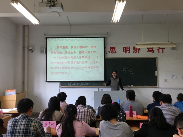 5月17日,校第三期教职工党员培训班在4教206教室举行专题论坛。人文学院副教授汪晓宇受邀作了题为《如何做“四有”好老师》的专题报告。培训班全体学员聆听了报告,报告会由党委宣传部居洋主持。